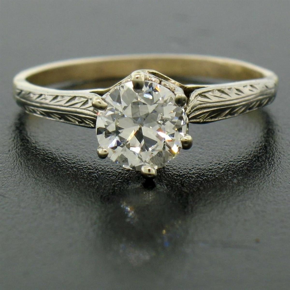 One Antique Etched 14k Two Tone Gold 0.80ct European Cut Diamond Solitaire Engagement Ring. Item Details: Material: Solid 14K Yellow and White Gold, Weight: 1.9 Grams, Stone(s): (1) Natural Genuine Diamond - Round European Cut - Prong Set - E Color - VS1 Clarity, Total Carat Weight: 0.80ct (Exact), Ring Size: 6.75 (We can custom size this ring.), Ring Width: 7.45mm, Ring Height: 7.98mm rise off the finger, Condition: Antique engagement ring w/ original finish. Excellent, ready to wear condition!