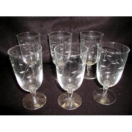 Set of six etched crystalLibbey/Rock Sharpe water goblets have a leaf and scroll design. From C.1930-40. Diamond cut stem with rossette base. All in excellent condition. Large size for multiple use. Measure 7H X 3.25W.Additional pieces available in MM2243,MM2239.