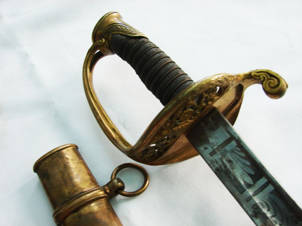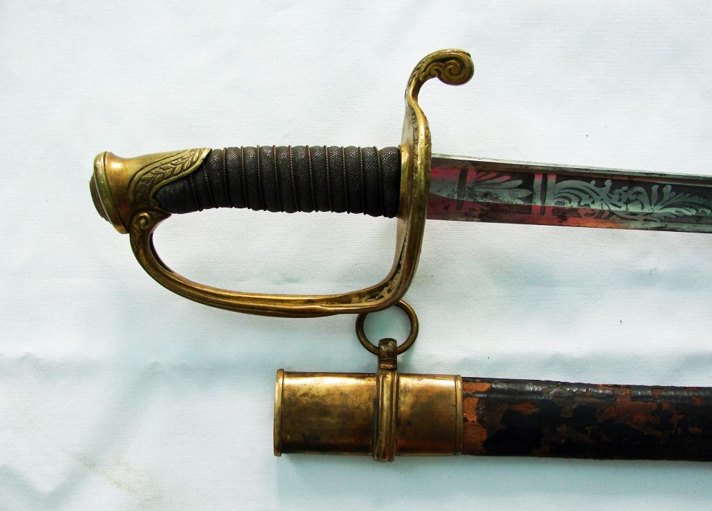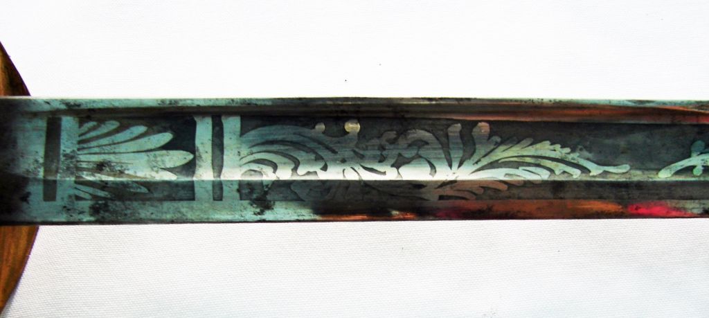 European sword has acid etching on blade, sharkskin with wire wrap grip and a worn and cracked leather scabbard.