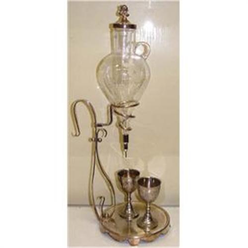Impressive vintage Oberglas Austria etched glass and silver plated wine cooler with engraved under tray and florally chaised goblets. The stand a holder for the shapely wine vessel into which slips the inner flask. The inner flask is filled with chilled ice water and inserted in the wine flask, thus cooling it. The flask itself is adorned with an etched depiction of lush grape vines, the bottom of which is a spring load dispenser. No pouring. Touch the goblet to the dispenser and cool vino flows, bears original Oberglas Austria paper labels and would make a great gift or addition to any fine household or collection.