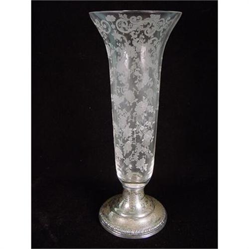 10 1/2 inch Tall Vase on a 3 5/8 inch Sterling Base ** Flute Style with All Over Etched Daisies ** Sterling Base is Weighted ** The Mark is a Face with a Crown and Script S ** Also Numbered 427 ** I cannot find this signature in any of my references. ** Stunning and in Excellent Condition ** No Chips or Cracks