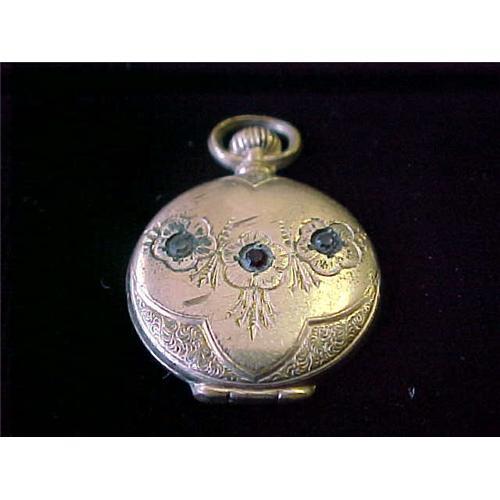 Etched Gold Locket With Red And White Rhinestones. The shape of the piece is a faux watch piece. The front is etched in a flower design with stones in the center. There is a red stone in the center, a white stone on the left and what appears to be a darker stone on the right. The color is impossible to see. The locket is in nice condition and needs a good cleaning.