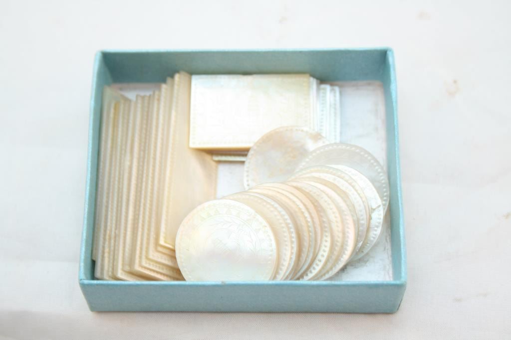 Etched Mother of Pearl gambling markers or chips, some are round, some are square or oblong. 43 in all. They are etched on both sides and are in perfect condition.