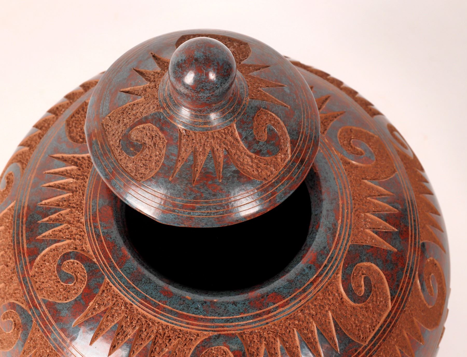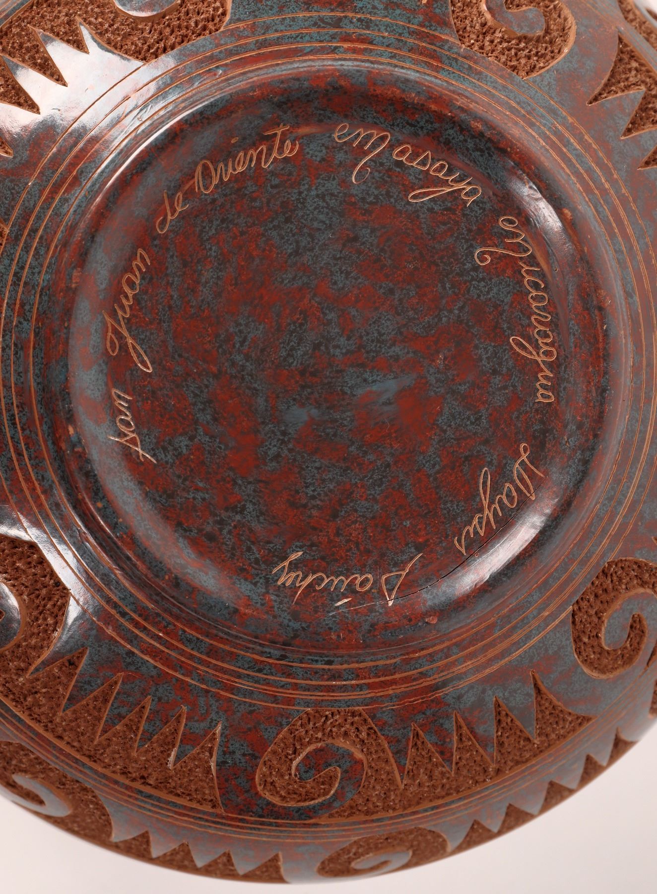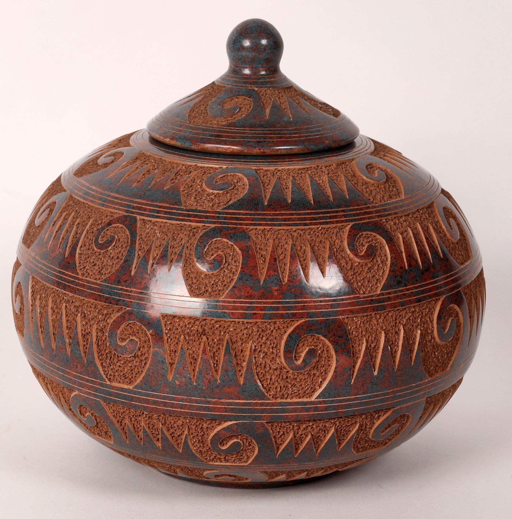 Daysis Sauchy pot, deeply etched and stippled with wave and mountain designs. 8.5" x 8.5".