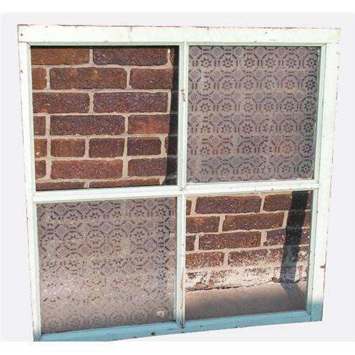 This is a nice, solid window featuring 2 frosted, etched glass panes. It has light mint green paint that is worn from age. The other side has brown paint. Brought to you by Sand Hill East.