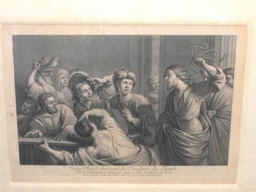 Last minute find: framed matted, under glass (period to aprox 1860) appears to be a steel plate engraving in French of Jesus chasing the vendors from the temple. Jan Haussart (Jean Hassard 1680-1749). Image: 9"x14". Overall: 22"x 26". French matted. Poly