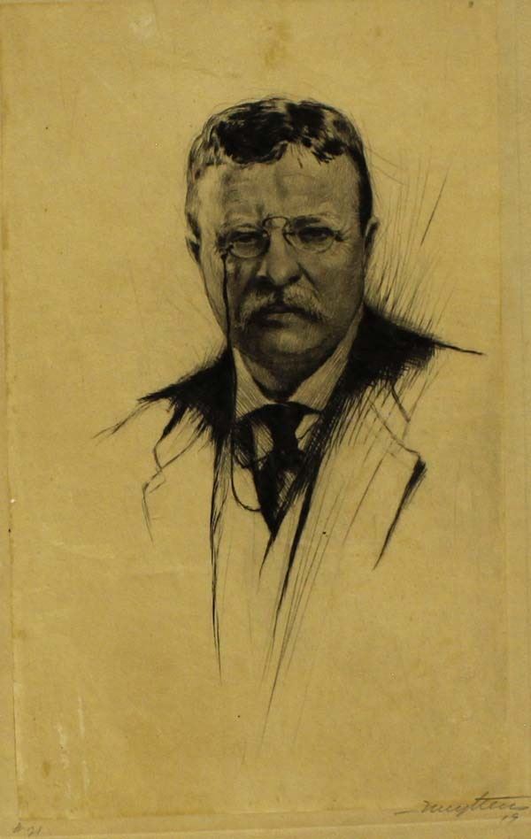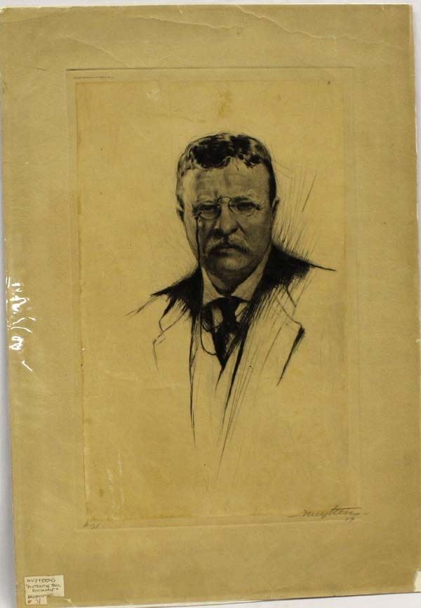 1919 Signed Dry Point Etching Print of Theodore Roosevelt by Josef Pierre Nuyttens, signed in lower corner, #21, visual measures 9.5'' x 15.5'', in the top corner reads ''Copyright 1919. Anderson Art Galleries, Chicago'' FYI: ''Josef Nuyttens (1885 - 1960) Josef Pierre Nuyttens was active/lived in Illinois, New York / Belgium, England. Josef Nuyttens is known for landscape, cityscape and animal painting, book illustration. Aliases: Josef-Pierre Nuyttens, Joseph Nuyttens, Joseph Pierre Nuyttens, Painter, Etcher, Illustrator''