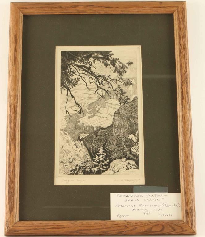 "Grandview Canyon-Grand Canyon" sighend lower right #3/50. Image measures 10"x6 1/4" in mat with wood frame. Born in Cleveland, Ohio, Ferdinand Burgdorff studied at the Cleveland School of Art and in Paris with Rene Menard and Florence Este. In 1907, he headed West with the intention of becoming a desert landscape painter. He lived in box cars with railroad builders on the stretch of line between Yuma and Calexico and traveling by wagon or horseback, accompanied surveyors on many trips into the desert. He also worked for a period in Santa Fe, New Mexico, where he painted the sandy wastes near Albuquerque in the region known as the Sandia. He then moved to California where he was an illustrator for The Sunset magazine, then a new publication. Many of the paintings he had made earlier were reproduced in this magazine. In California, he first lived in Carmel where he was an active member of the Carmel Colony. He later settled in nearby in Pebble Beach, building a home on Rondo Road. In 1911, he took an exhibition of his desert paintings back to his home town of Cleveland, and sold enough to finance a two-year trip around the world. His main objective was to see Greece and Egypt because they were ancient desert worlds. He also painted along the Nile, which reminded him of the Colorado River. When he died, he was the oldest working artist on the Monterey Peninsula, having painted many coastal views and abandoned mining towns in pastel, oil and watercolor. From 1907 to 1924, he made numerous painting trips to the Grand Canyon and the Hopi Reservation in Arizona. His work was both realistic and romantic, conveying a sense of mystery and drama in his landscapes.
