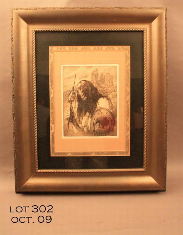Etching by artist Hal Reed titled “Smoke Signals.” Beautifully matted and framed in turn of the century antique frame. Signed, and proofed by artist at the bottom, along with the title. Approx. 37”x 31.” Est. $250-$500.