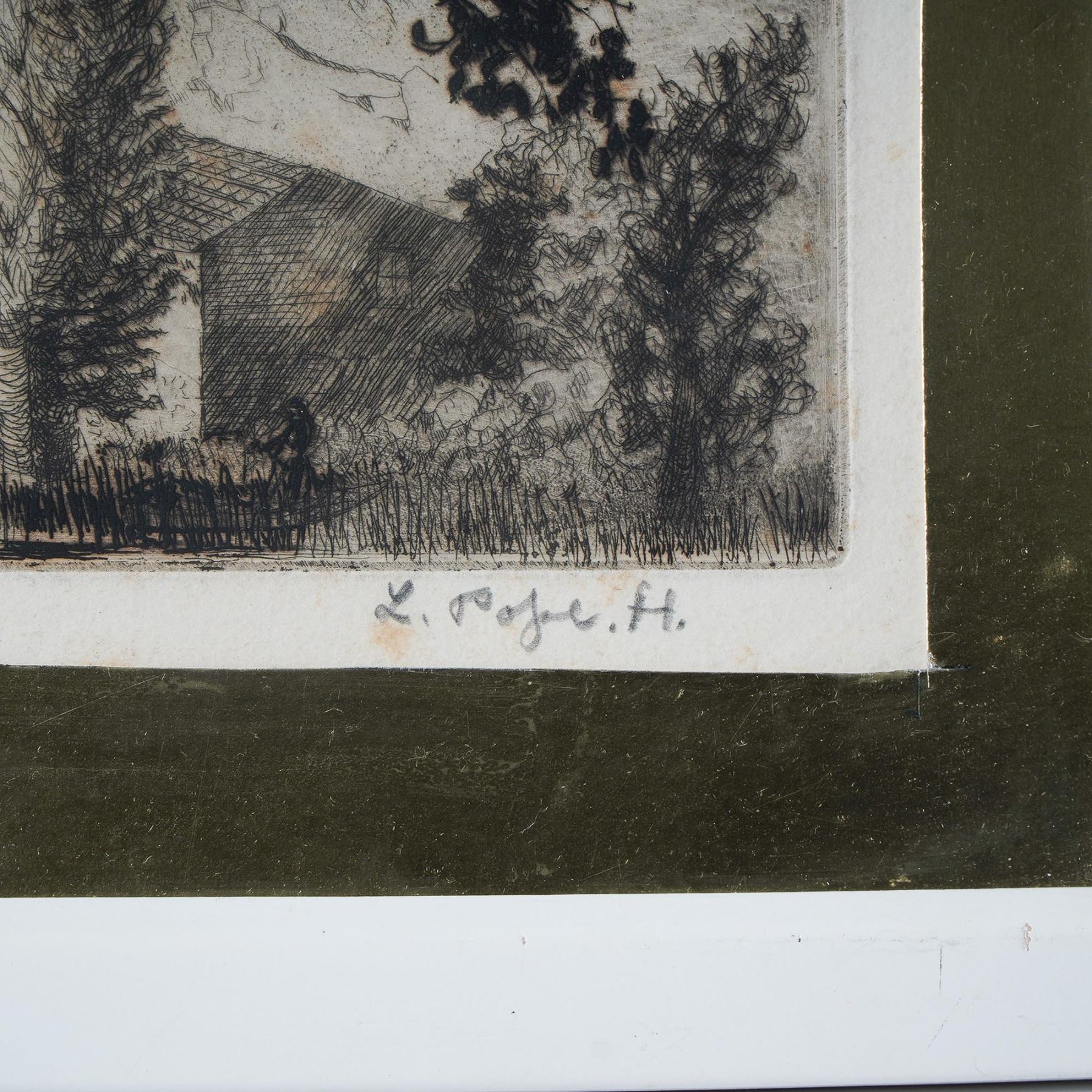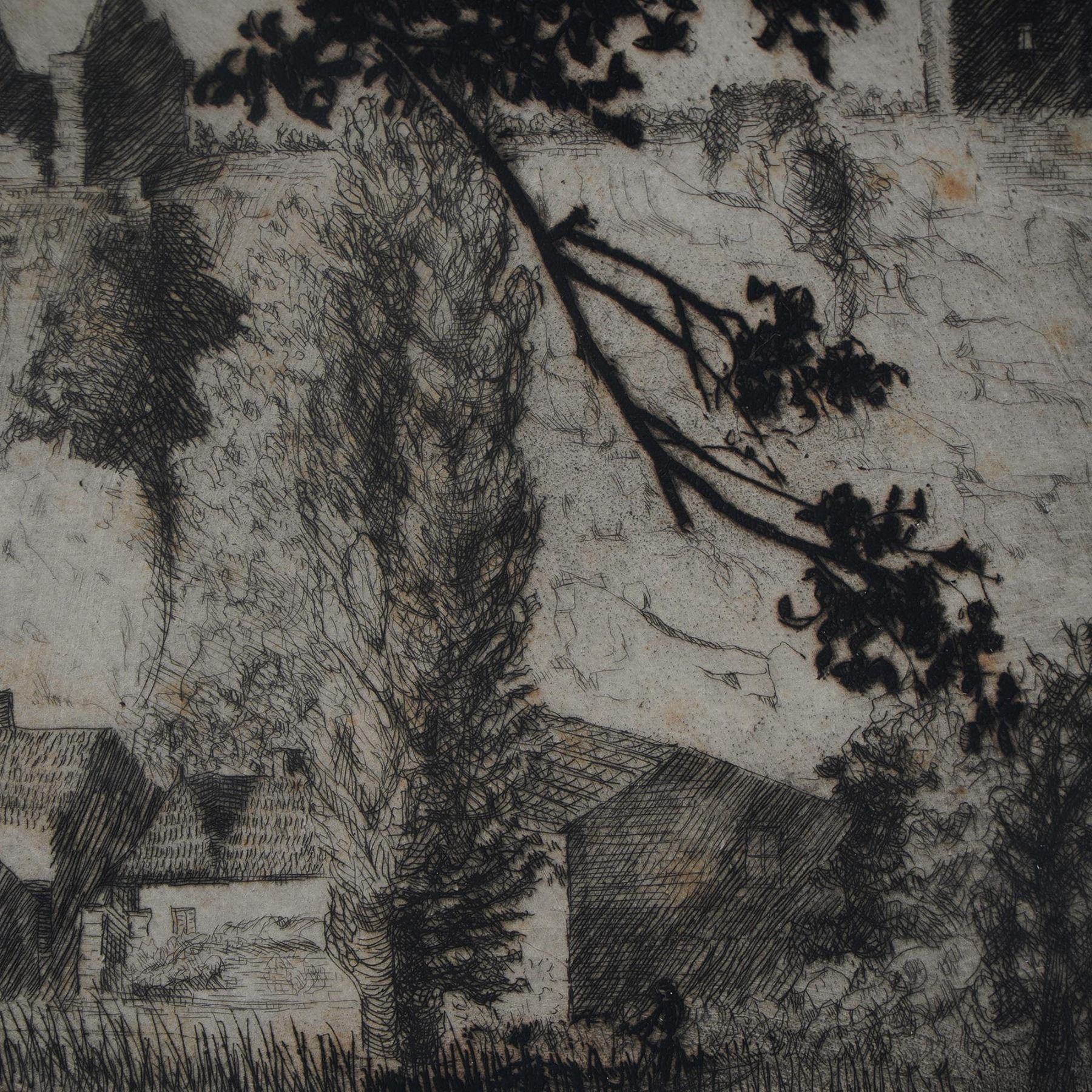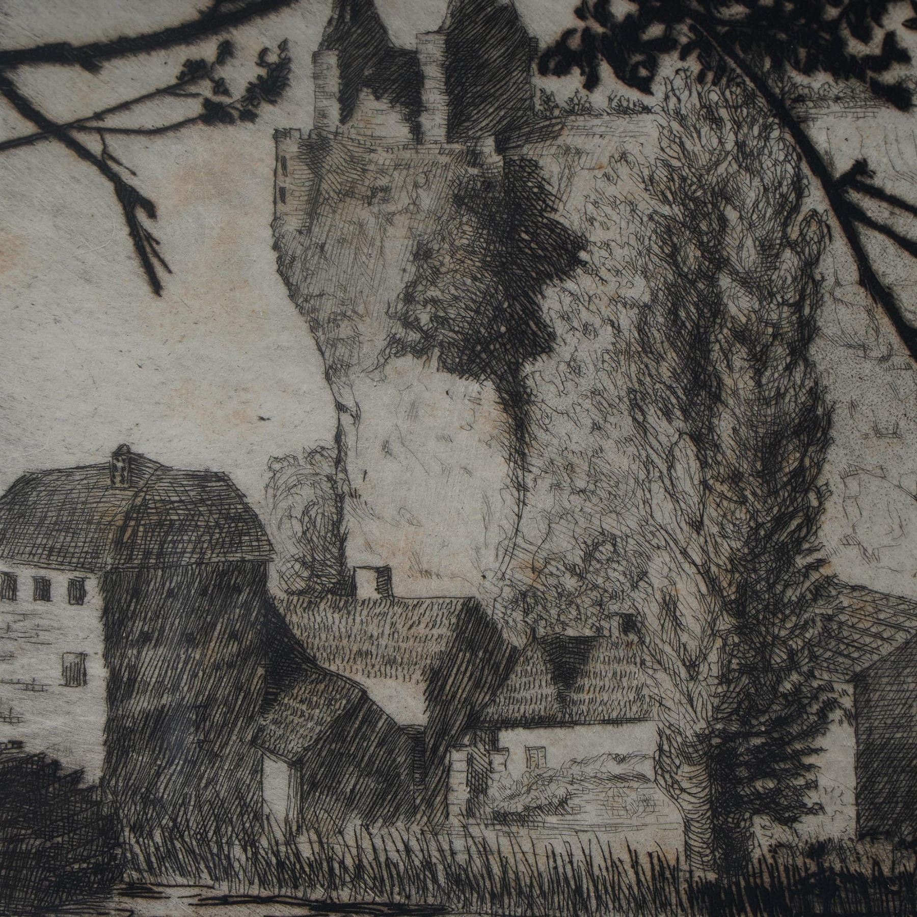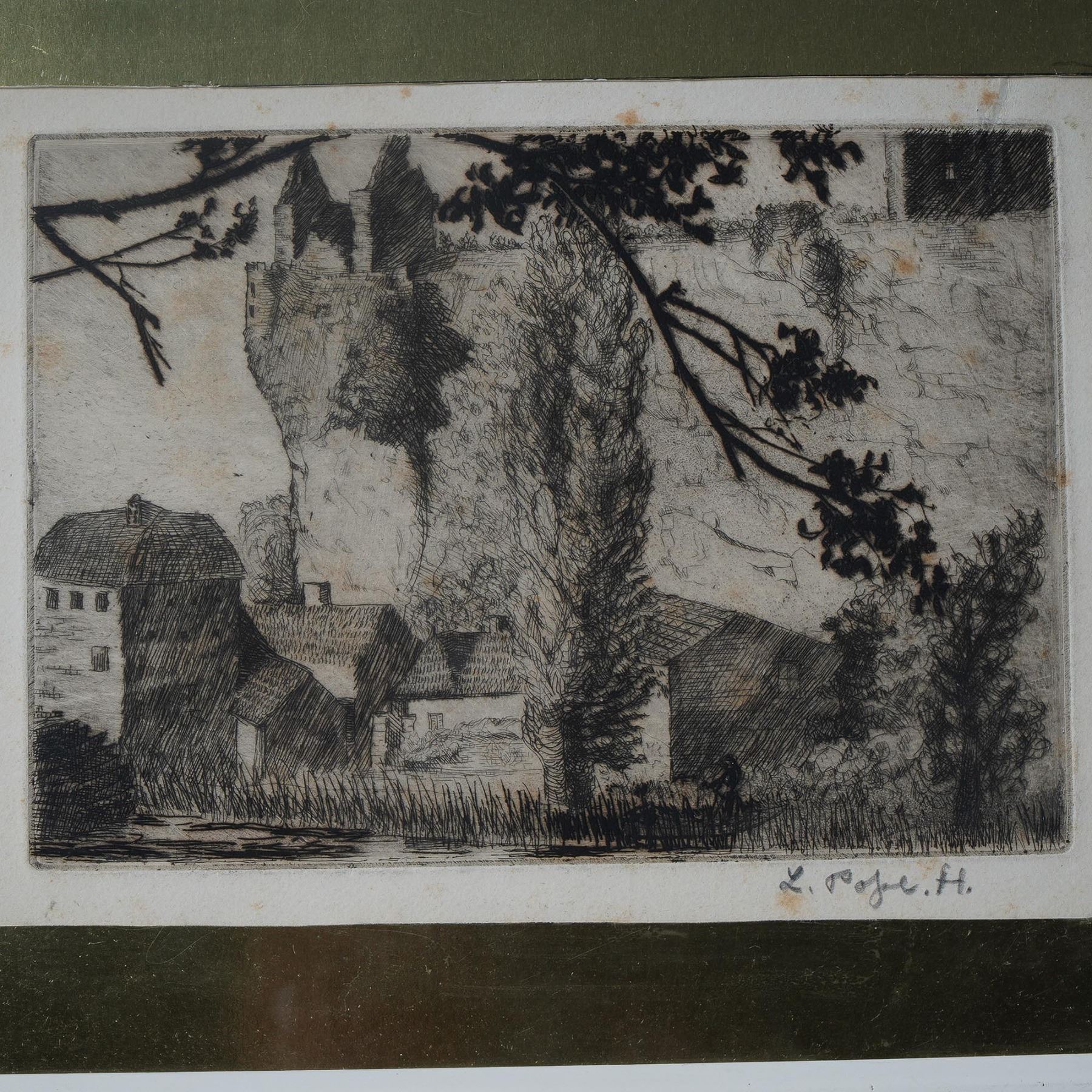 Framed black and white etching depicting a village at the base of a towering cliff with castle ruins atop, surrounded by trees and branches in the foreground. The etching is signed in pencil L. Pogle. H. (?) in the lower right corner. Presented in a modern white frame with a gold-toned mat.