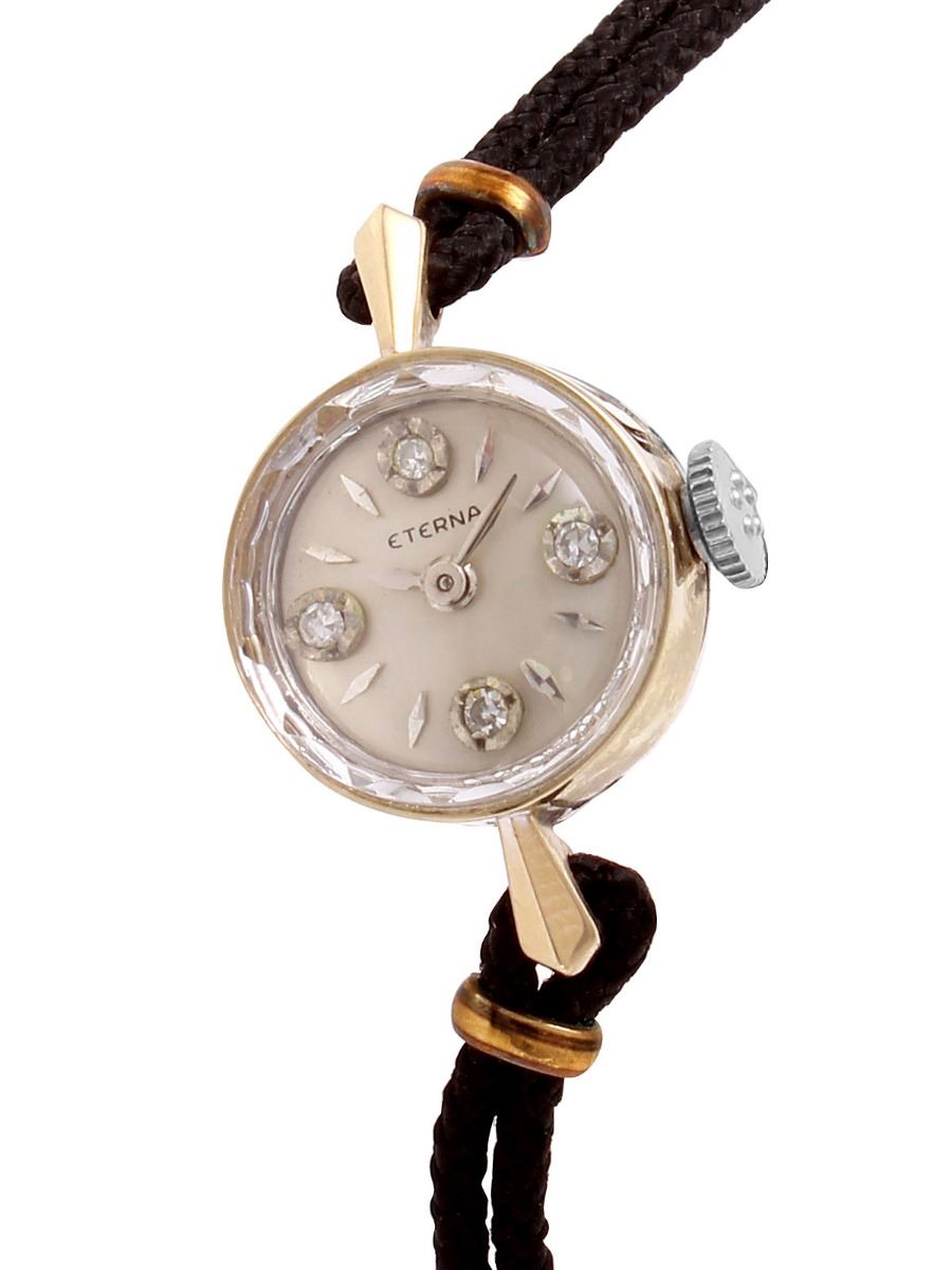 Designer Eterna 14KT white gold manual wind watch with diamond markers. Features a round two tone bezel, with “diamond cut” detailing. Markers with diamond accents. Condition: Movement is very good and running, case is very good and dial is very good. Set on an twisted double rope bracelet, closing securely with a fold-over clasp and safety chain. Clasp is gold filled. No box, no papers. The descriptions listed should not be construed as an appraisal. The detail is provided as a guideline for color, clarity, weights and measurements to the best of our ability. We welcome inspections. WE SHIP WORLDWIDE!