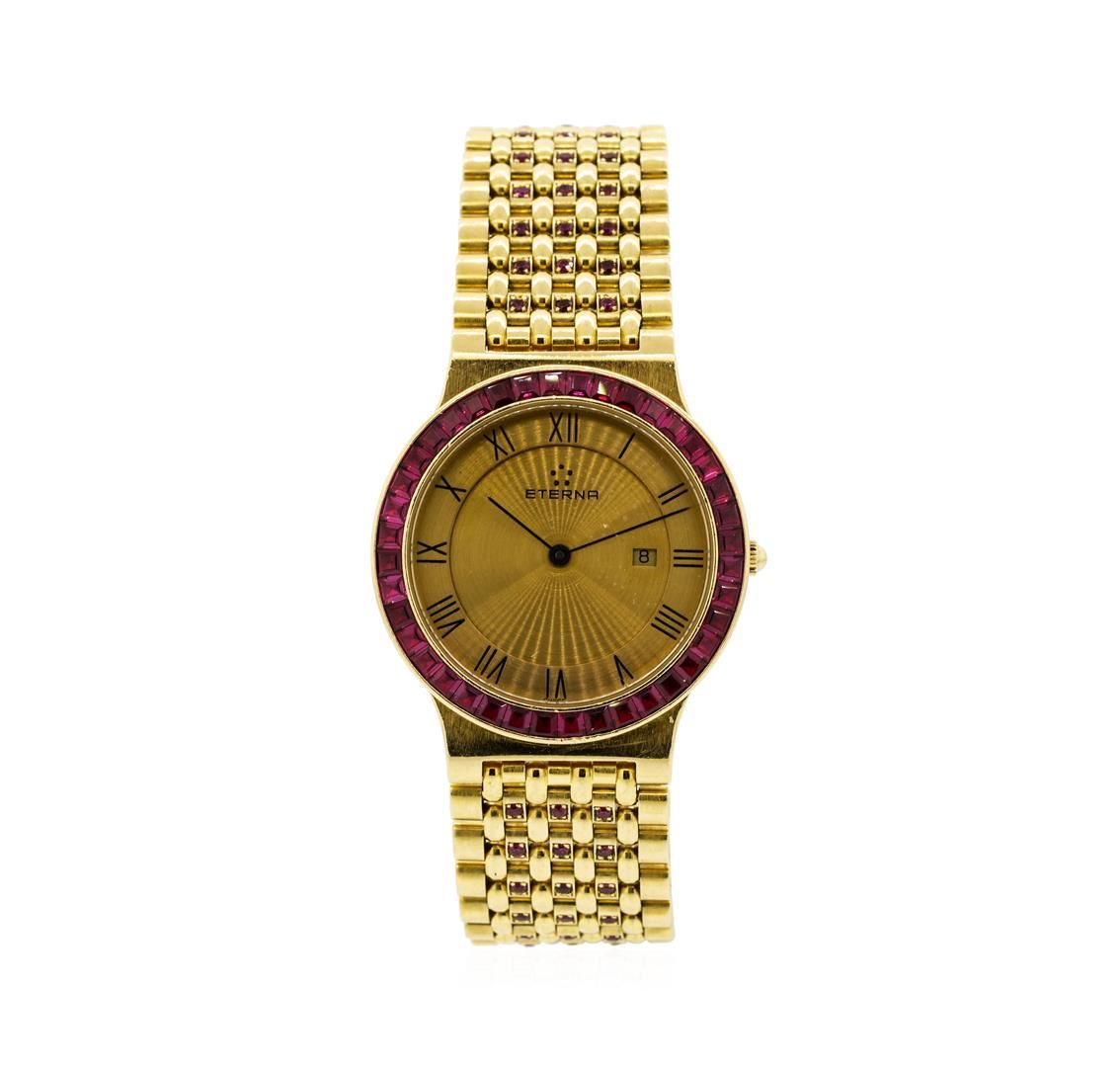One Eterna 18KT yellow gold manual wristwatch with a case measuring 32 millimeters, gold dial with Roman numerals, black baton-type hands, square cut ruby-set bezel with a solid 18KT yellow gold link strap set with ninety-six round rubies, terminating in a double deployment clasp. Serial number 160.7484.68.