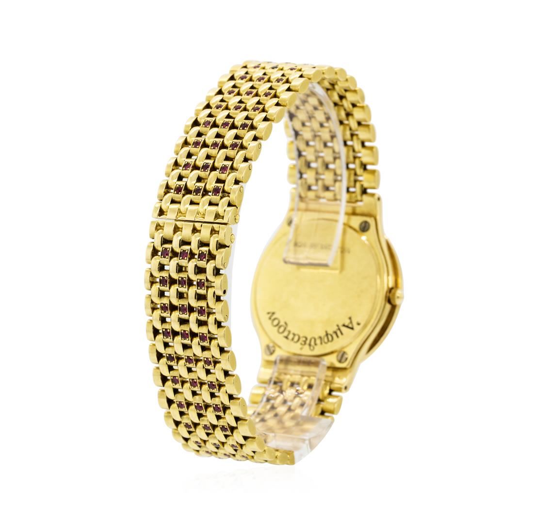 One Eterna 18KT yellow gold manual wristwatch with a case measuring 32 millimeters, gold dial with Roman numerals, black baton-type hands, square cut ruby-set bezel with a solid 18KT yellow gold link strap set with ninety-six round rubies, terminating in a double deployment clasp. Serial number 160.7484.68.