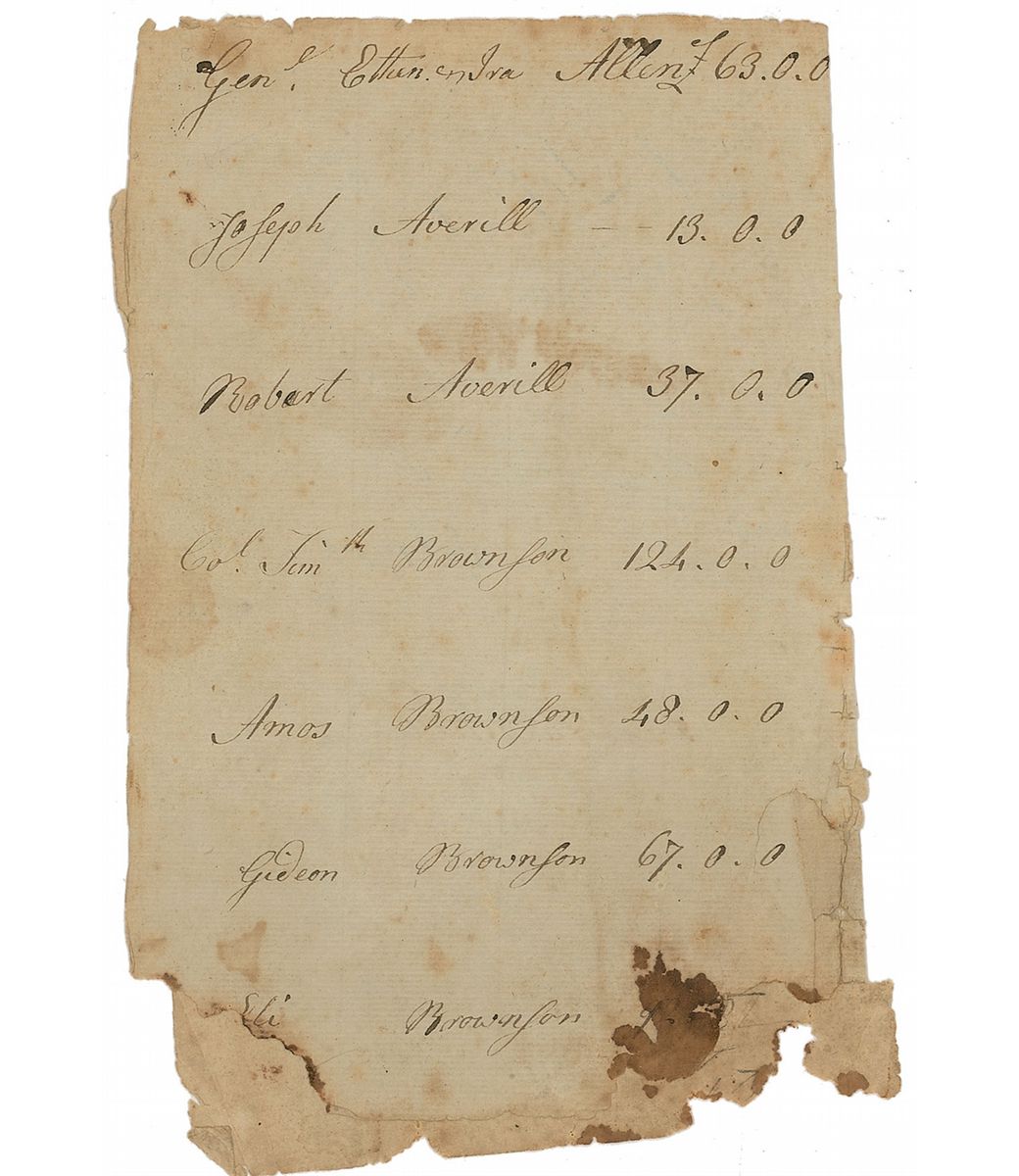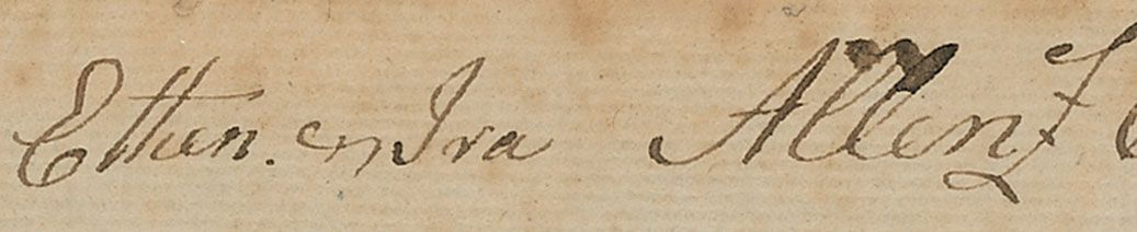 Farmer, businessman, land speculator, philosopher, writer, American Revolutionary War patriot, hero, and politician. ADS, signed “Ethan & Ira Allen” all written by Ethan Allen in the text, three pages on two adjoining sheets, 5 x 7.5, June 20, 1781. Titled on first page, “A List of the Polls and rateable estate of the Town of Sunderland for June 20 AD 1781 Sunderland.” On the second page, one beneath the other, are six names and the “rateable estate” values: “Genl Ethan & Ira Allen £63.0.0; Joseph Averill 13.0.0; Robert Averill 37.0.0; Col. Timth Brownson 124.0.0; Amos Brownson 48.0.0; Gideon Brownson 67.0.0; Eli Brownson…” All in the hand of Ethan Allen, they are in alphabetical order. On the reverse of the integral leaf (the back cover of the booklet), Allen has written: “The List for the Year of our Lord 1781.” Beneath which are some pen markings and some arithmetic in another hand. In good condition, with paper loss to bottom edge, moderate toning and staining, small binder holes along hinge, rough edges, and scattered creases.