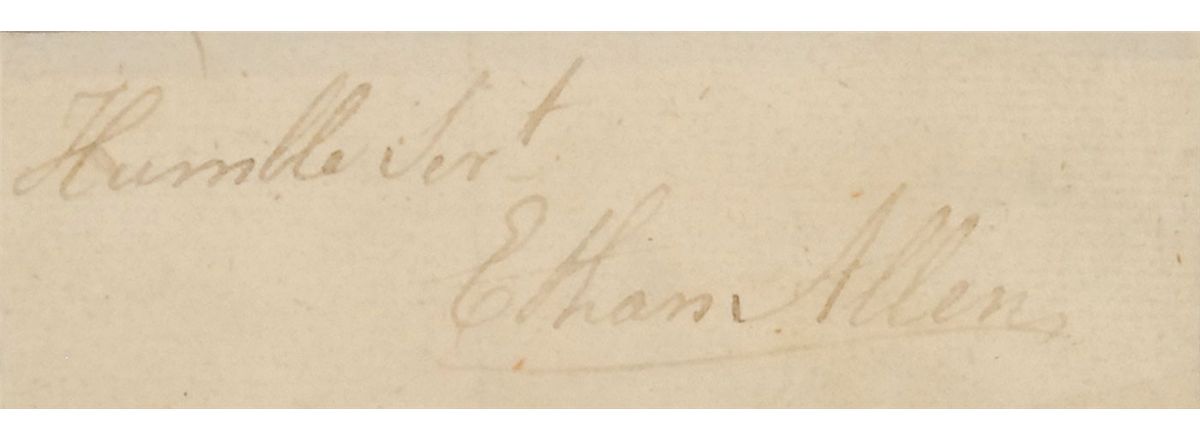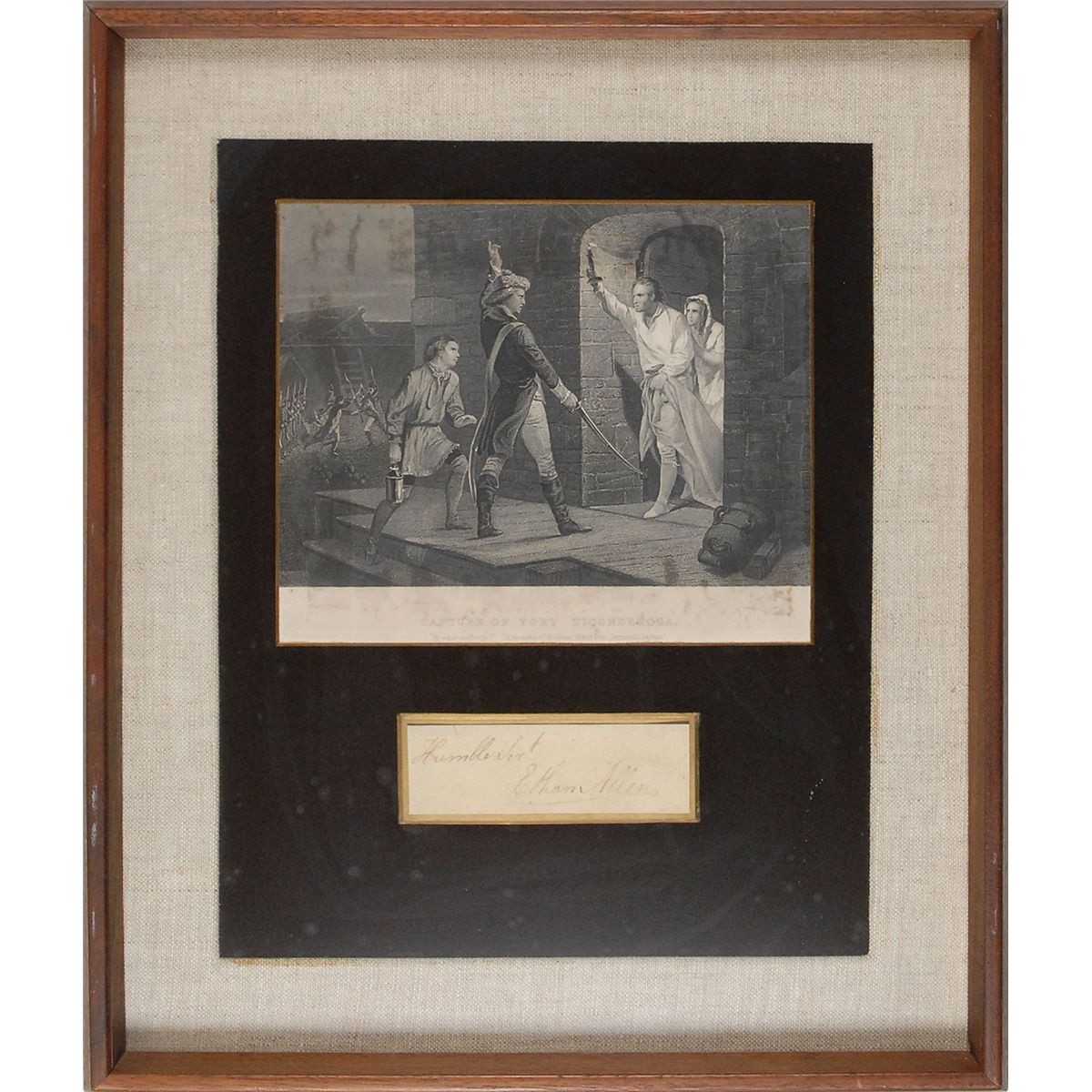 Farmer, businessman, land speculator, philosopher, writer, American Revolutionary War patriot, hero, and politician (1738–1789). Rare ink signature, “Humble Sev’t, Ethan Allen,” on an off-white 3.5 x 1 slip. Cloth-matted and framed with an engraving of the capture of Fort Ticonderoga to an overall size of 12 x 14. In fine condition.