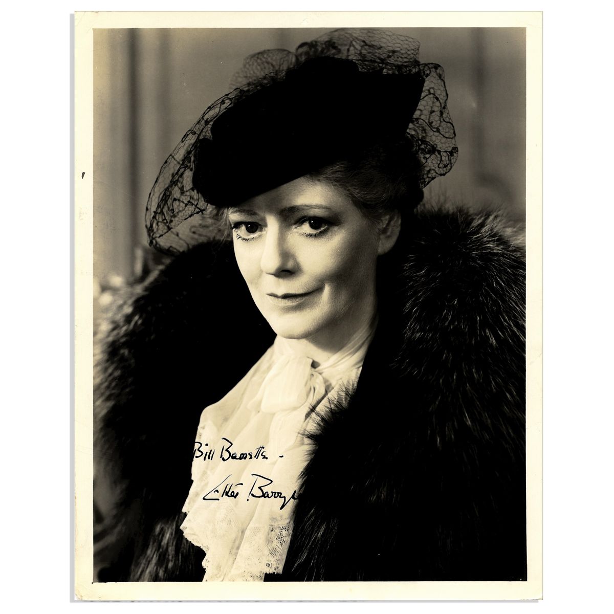 8'' x 10'' publicity photo inscribed and signed by Ethel Barrymore during the 1940 production of ''The Corn is Green'' at New York's National Theatre. Signed in black ink: ''To Bill Bessette / Ethel Barrymore''. Backstamp for Vandamm Studio, well known Broadway photographer, is on the verso. Minor soiling and edge creasing, else very good condition.