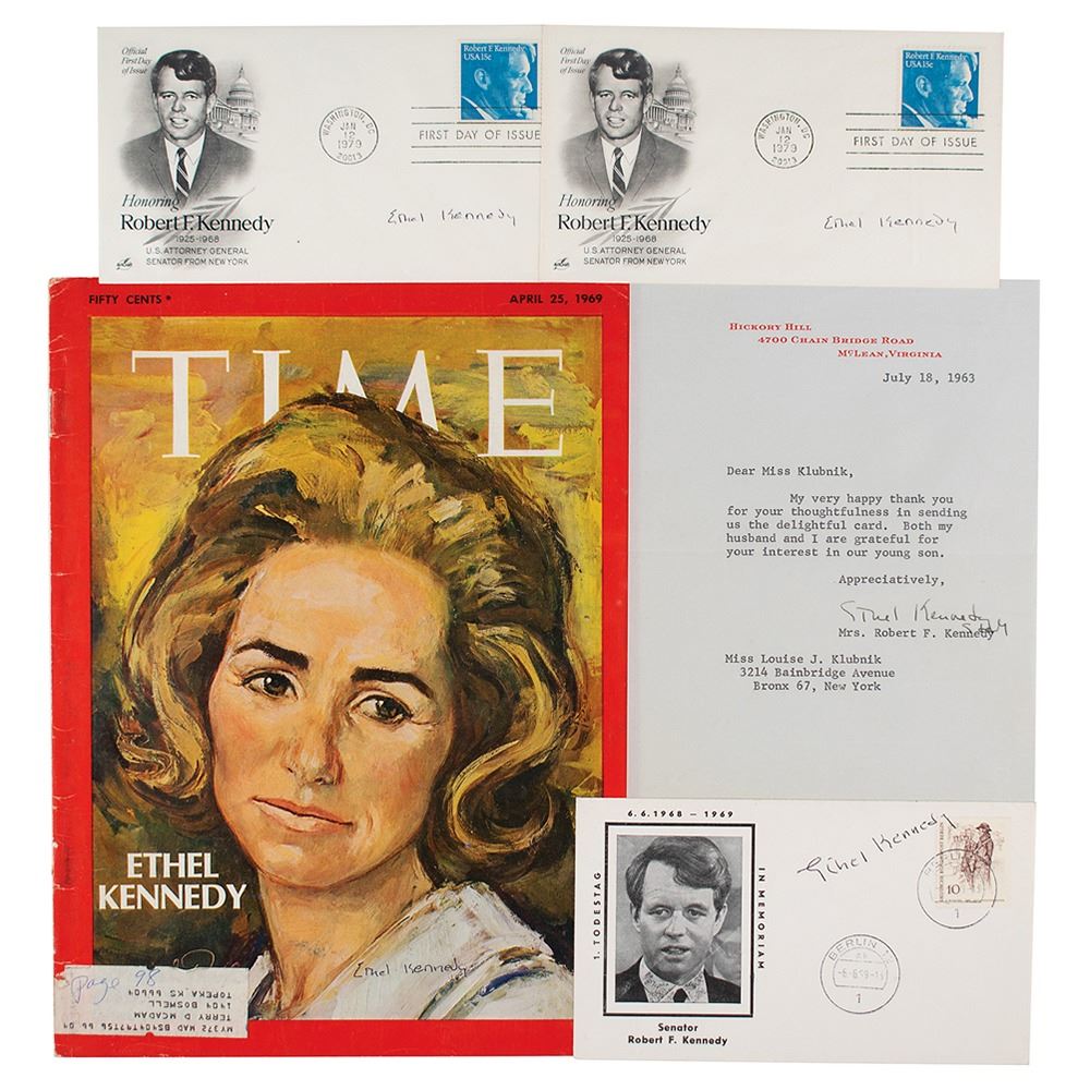 Five items signed by Ethel Kennedy, including: three covers with cachets honoring her husband Robert F. Kennedy, each signed in ballpoint; a Time magazine from April 25, 1969, signed in ballpoint; and a TLS from July 18, 1963, sending thanks for congratulations on the birth of their son Christopher. In overall fine condition. Accompanied by the original mailing envelope for the letter.