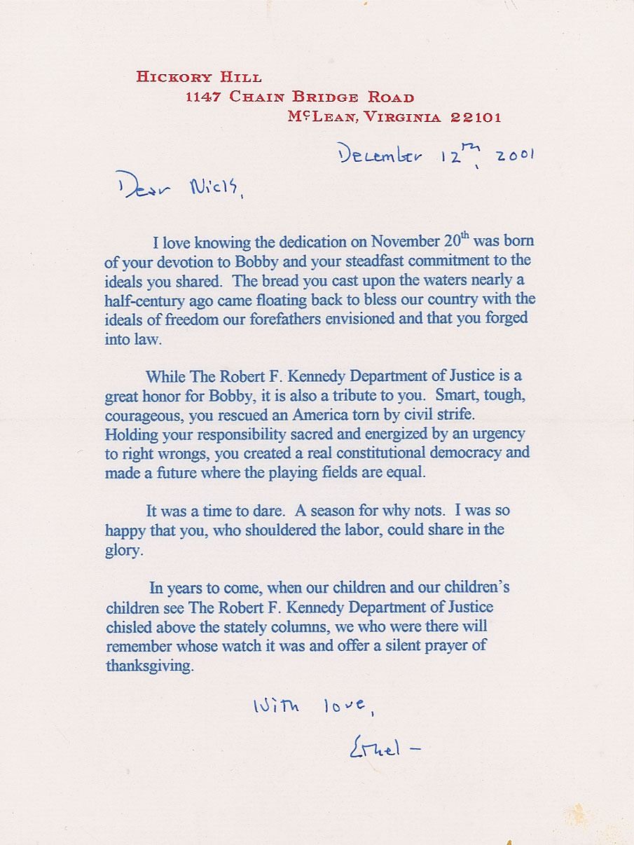 TLS signed “With love, Ethel,” one page, 5.75 x 7.75, Hickory Hill letterhead, December 12, 2001. Letter to Nicholas deB. Katzenbach, in full: "I love knowing the dedication on November 20th was born of your devotion to Bobby and your steadfast commitment to the ideals you shared. The bread you cast upon the waters nearly a half-century ago came floating back to bless our country with the ideals of freedom our forefathers envisioned and that you forged into law. While the Robert F. Kennedy Department of Justice is a great honor for Bobby, it is also a tribute to you. Smart, tough, courageous, you rescued an America torn by civil strife. Holding your responsibility sacred and energized by an urgency to right wrongs, you created a real constitutional democracy and made a future where playing fields are equal. It was a time to dare. A season for why nots. I was so happy that you, who shouldered the labor, could share in the glory. In years to come, when our children and our children's children see The Robert F. Kennedy Department of Justice chiseled above stately columns, we who were there will remember whose watch it was and offer a silent prayer of thanksgiving." In fine condition. In remembering "a season for why nots," Ethel Kennedy evokes RFK's famous words: 'There are those who look at things the way they are, and ask why. I dream of things that never were, and ask why not?' When Robert F. Kennedy resigned as Attorney General to run for the U.S. Senate in 1964, he was succeeded by the Deputy Attorney General, Nicholas Katzenbach (1922–2012). In 1966, Katzenbach became LBJ’s Undersecretary of State, serving until the end of Johnson’s presidency in 1969.
