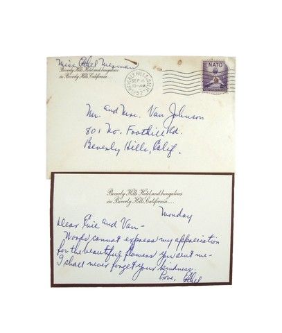 Ethel Merman Personally Handwritten & Signed Thank You Note - Ethel Merman, the iconic legendary performer who literally never needed a microphone, even in her largest theaters to be heard "in the cheap seats", was as over-the-top and both beloved, and impossible as the characters she portrayed. Among her greatest hits was Irving Berlin's "Call Me Madam". She starred in the hit Broadway musical in 1950, and won the Tony Award. In 1951 she was asked to reprise her role in the motion picture. It was at that time that her good friends actor Van Johnson and his wife Evie sent her a huge basket of her favorite flowers to congratulate her for her role before the start of production. The film was a hit and she went on to win a Golden Globe for Best Actress, which was something that Van had predicted when he sent the flowers! This is a wonderful rare handwritten note from Ethel Merman on Beverly Hills Hotel stationary sent to Van and Evie thanking them for the flowers just before she was about to start filming at Twentieth Century Fox Studios. It also includes the original envelope hand-addressed by Miss Merman to "Mr. and Mrs. Van Johnson". She also handwrote her name on the top of the return address. The envelope is postmarked from Beverly Hills and dated 1952 and includes the original cancelled three-cent stamp. This personal handwritten and signed card comes directly from Van Johnson's personal collection, and includes a Letter of Provenience from the Johnson’s daughter, Schuyler Johnson along with a copy of her famous controversial cover story article “My Life As A Hollywood Princess”, about her trials and tribulations growing up in Beverly Hills with a superstar father and extended “family” with some of the most famous celebrities in the world.