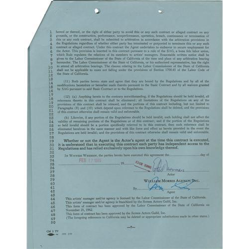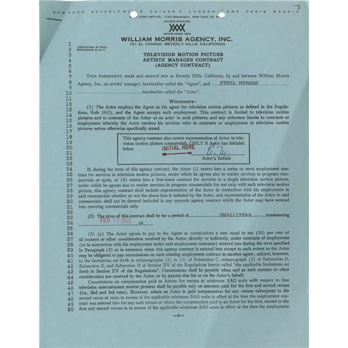 <B>Ethel Merman Signed Contracts.</B></I> Two William Morris Agency contracts, one a single page dated April 13, 1954, and signed by the star of stage and screen musicals in blue ink; the other dated February 17, 1965, and initialed by her on the front page and signed by her on the last page. Both are in Excellent condition with minimal wear. <I>With COA from PSA/DNA.</B></I>