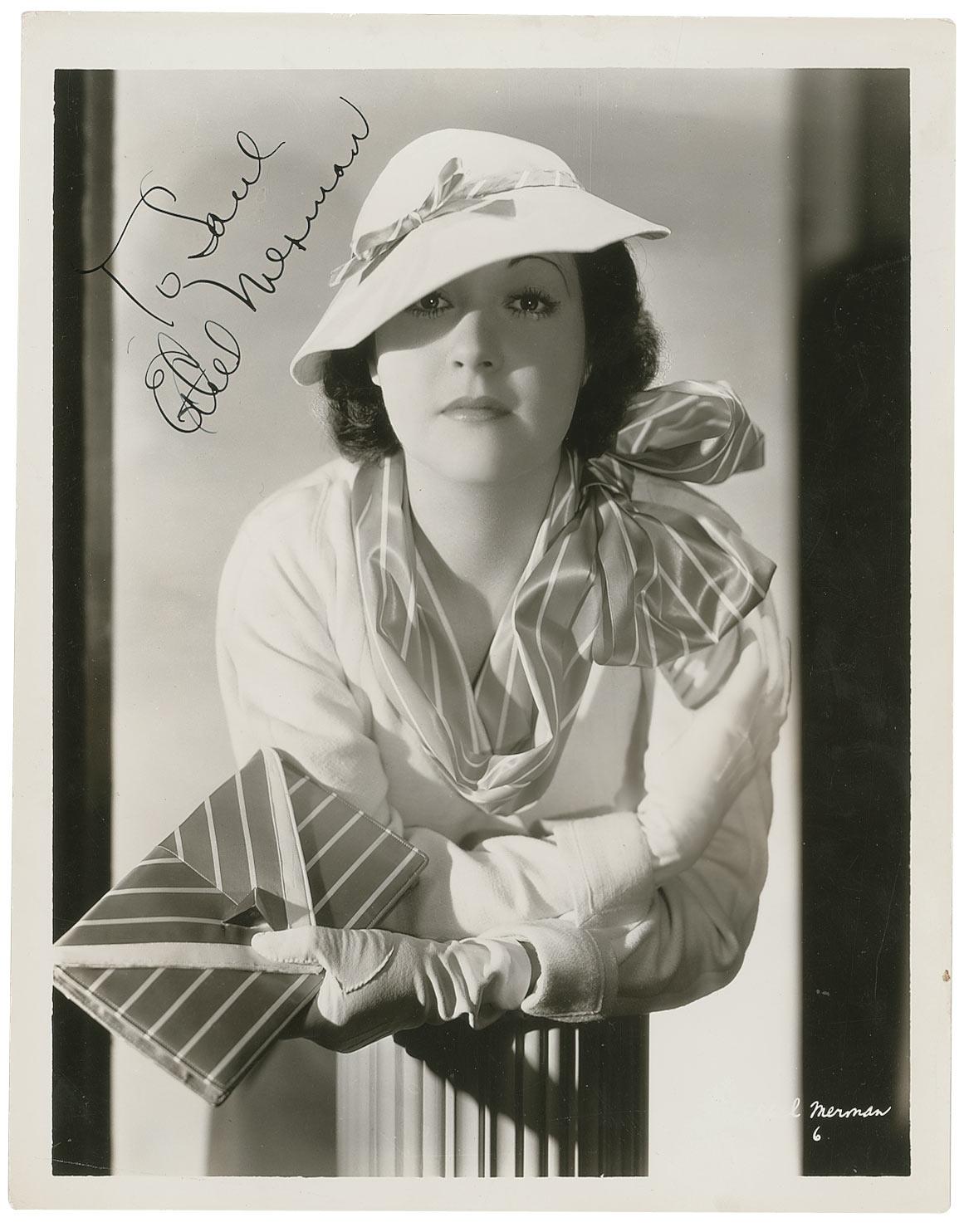 Pretty vintage glossy 8 x 10 photo, signed and inscribed in-person in fountain pen “To Saul, Ethel Merman.” Reverse of photo bears collector’s stamp date of March 16, 1935, the date the signature was acquired. In very good condition, with scattered creases and impressions, none affecting the bold signature. Saul Goodman Collection.