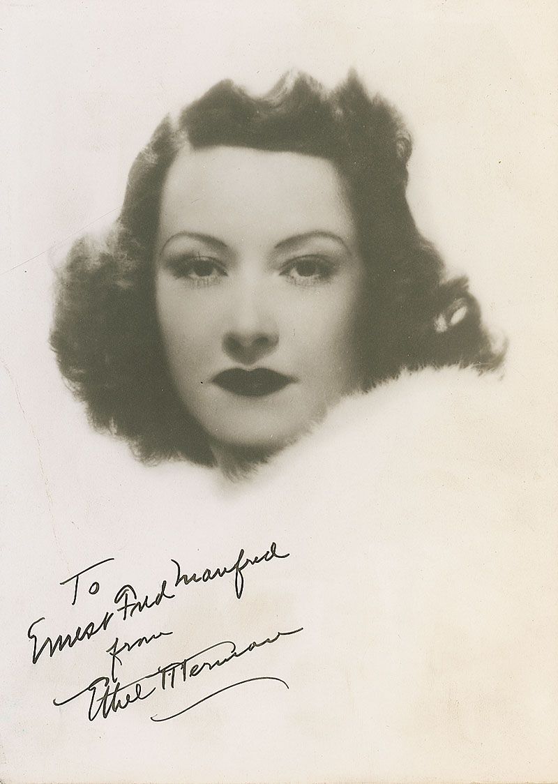 Vintage matte-finish 4.75 x 6.75 portrait of Merman, boldly signed and inscribed against the bright white background in fountain pen, “To Ernest Fred Manfred, from Ethel Merman.” In fine condition, with a slight diagonal crease to the left side.