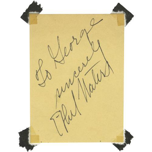 <B>Ethel Waters Autograph</B></I> - signed "<I>To George, Ethel Waters</B></I>" on an autograph book page. An American blues vocalist and actress, Waters (1896-1977) was the second African American ever to be nominated for an Academy Award. The paper with the autograph (2.5" x 3.5") has mounting tape at the corners.<BR><BR><b>Shipping:</b> Flat Material, Small (<a target="_blank" href="http://www.heritageauctions.com/common/shipping.php">view shipping information</a>) <BR><BR><B>Important n