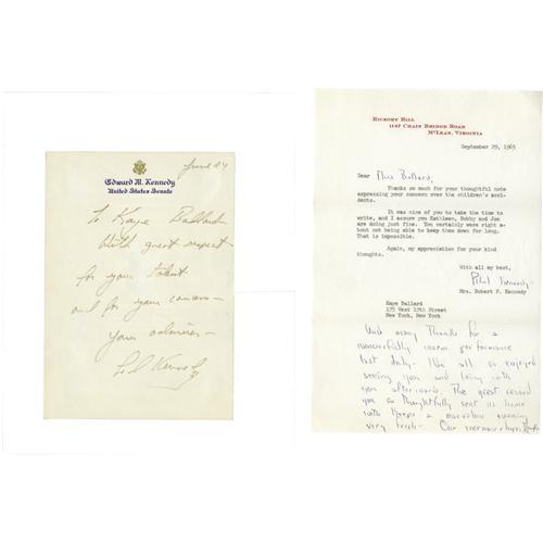 <B>Ethel and Ted Kennedy Handwritten Letters.</B></I> A typed letter with handwritten post-script, dated September 29, 1965, and signed by Ethel Kennedy in black ink, plus a handwritten letter dated June, 1984, and signed by Ted Kennedy in black ink. Both are in Excellent condition. <I>Accompanied by LOA from PSA/DNA.</B></I><BR><BR><b>Shipping:</b> Flat Material, Small (<a target="_blank" href="http://www.heritageauctions.com/common/shipping.php">view shipping information</a>)