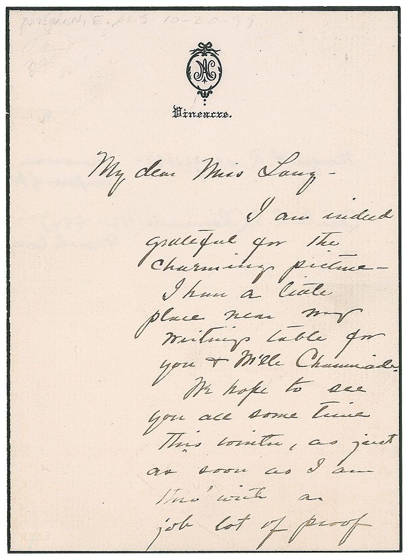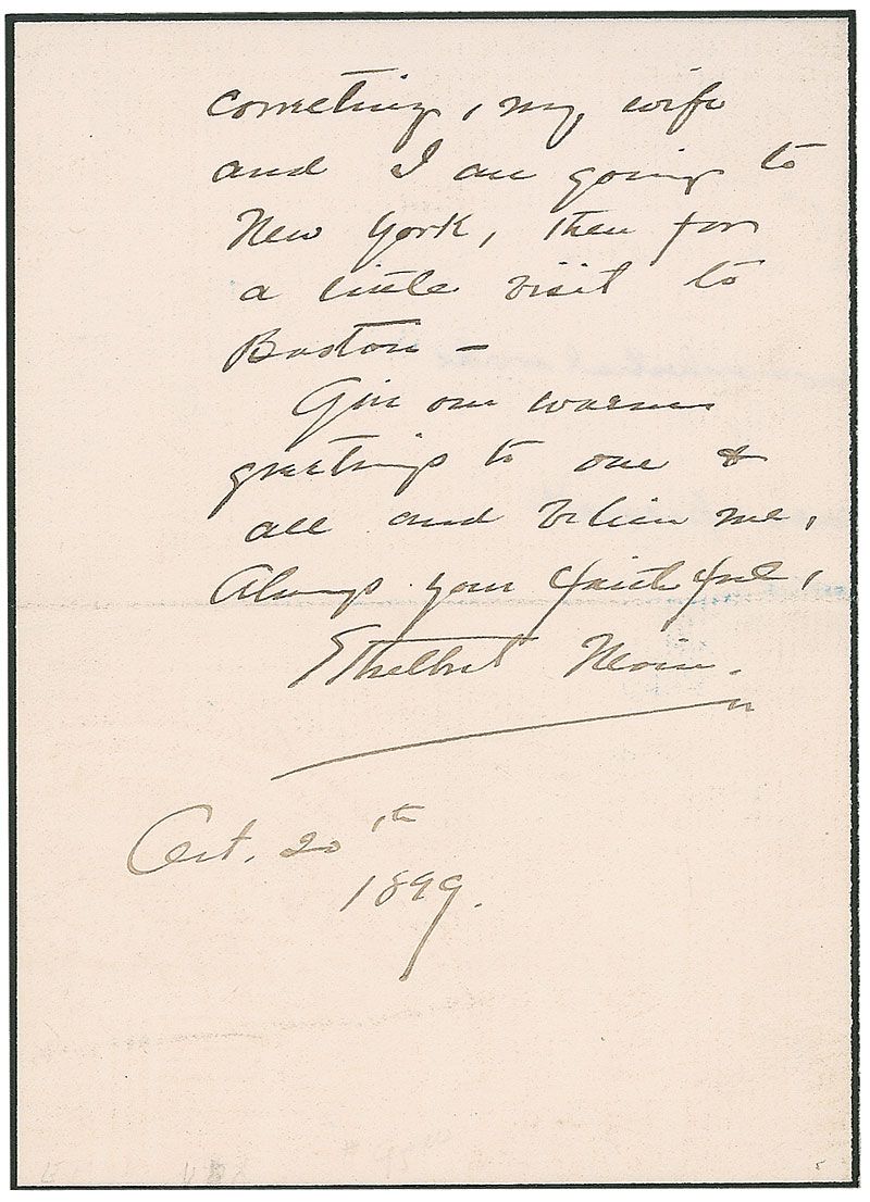 American pianist and composer (1862–1901). ALS, two pages on two adjoining sheets, 4 x 5.5, black-bordered Vineacre letterhead, October 20, 1899. Letter to Margaret J. Lang. In full: “I am indeed grateful for the charming picture–I have a little place near my writings table for you & M’lle Chaminade. We hope to see you all some time this winter, as just as soon as I am thru’ with a job lot of proof correcting, my wife and I are going to New York, then for a little visit to Boston–Give our warm greetings to one & all.” In fine condition, with a few light pencil remnants along top edge of first page.