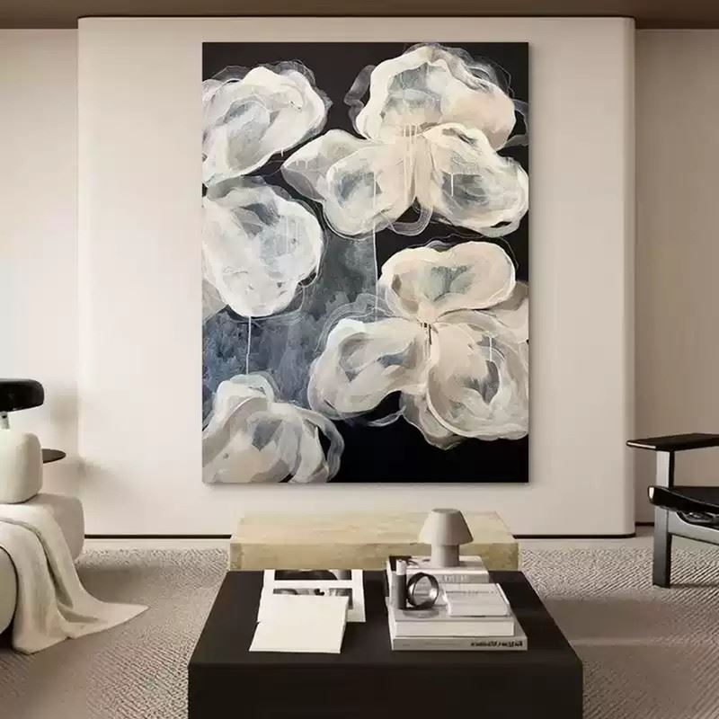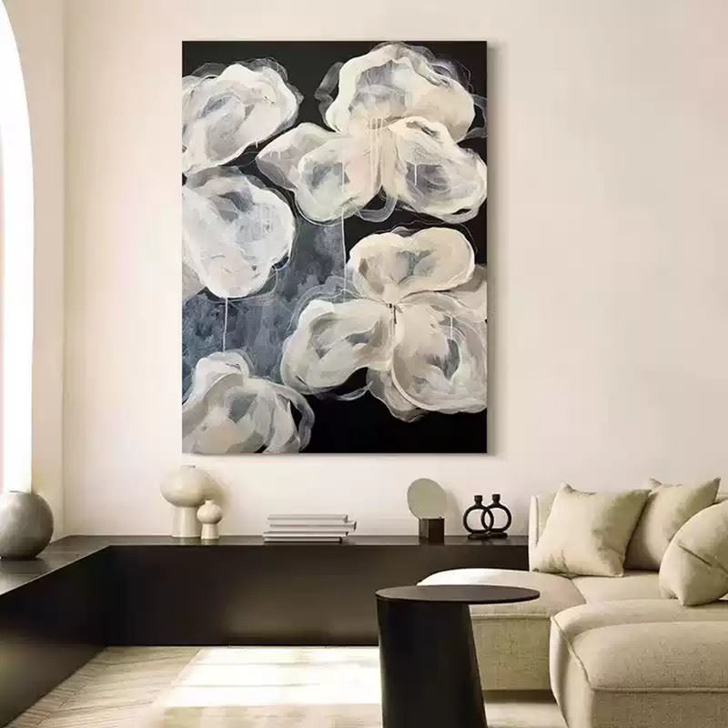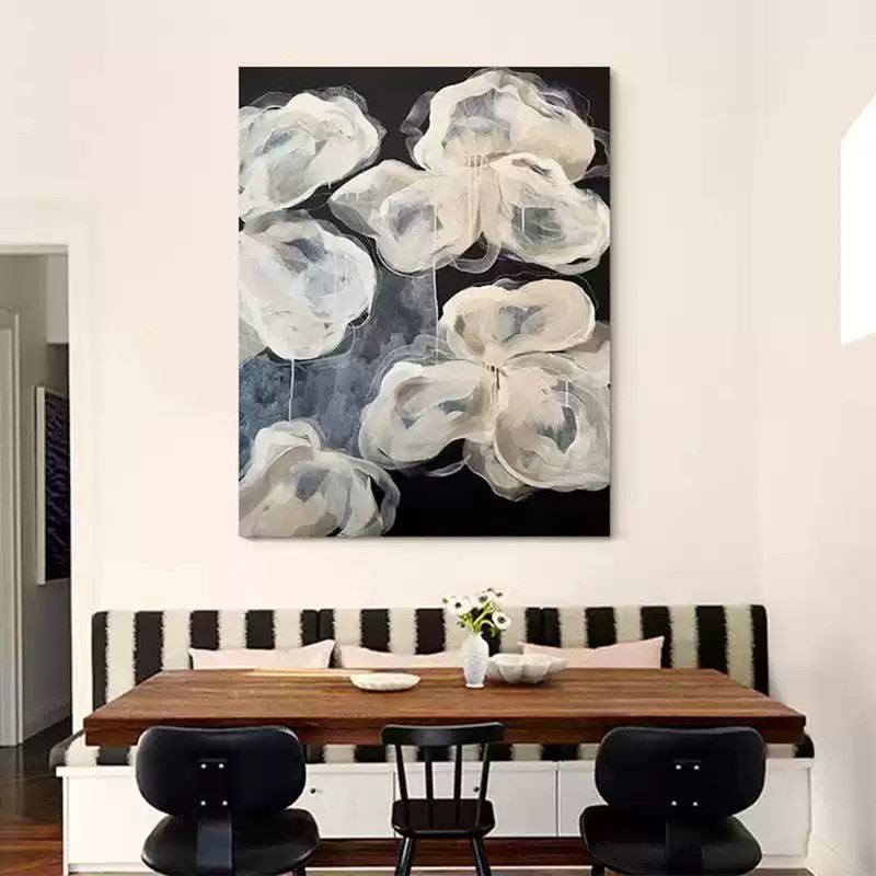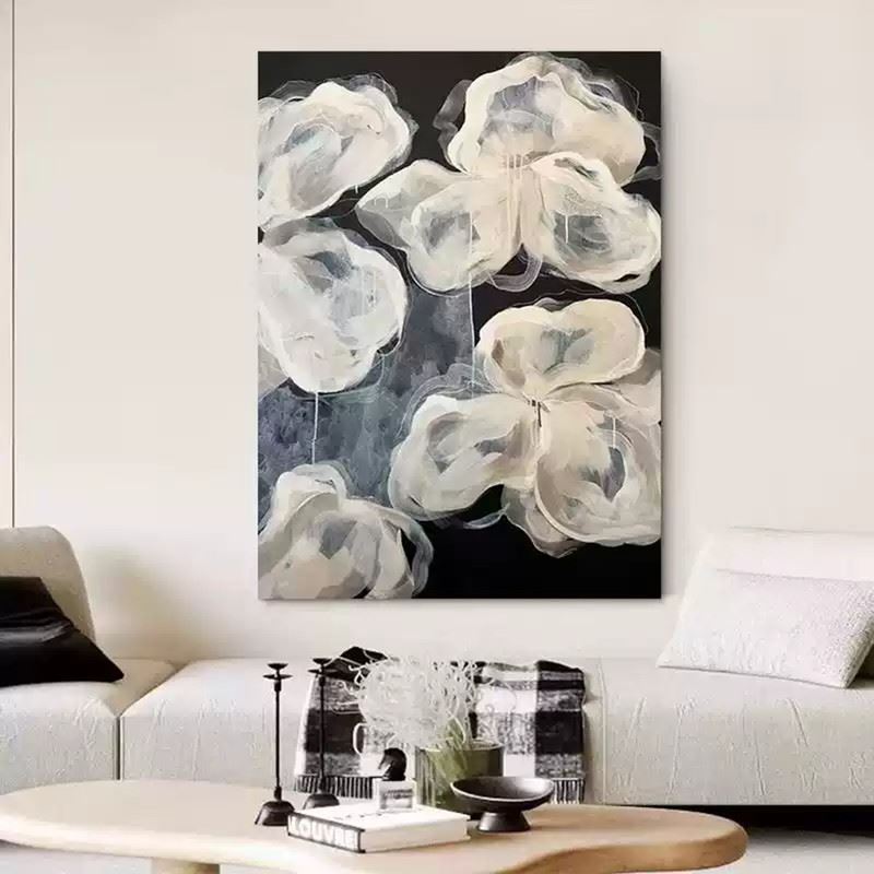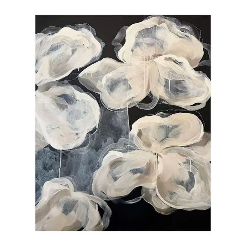 This delicate artwork features a collection of white flowers that appear almost translucent against a deep black background. The soft, flowing lines and gentle layering of paint create an ethereal, light quality, giving the flowers a dreamlike appearance. The minimalist color palette emphasizes the fluidity and grace of the petals, while the dark backdrop enhances their luminous presence. This piece evokes a sense of fragility and beauty, capturing the essence of nature in a quiet, almost otherworldly form. Dimensions: 28 x 39 inches.