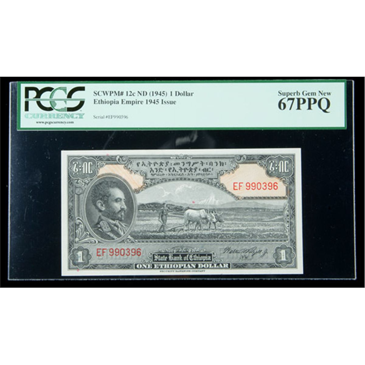 Ethiopa SCWPM# 12c, ND (1945) 1 Dollar. PCGS Superb Gem New 67PPQ. . Fr-P-12c. A superb example that is the single finest note from this issue graded by either of the two major grading services. A portrair of Emperor Haile Selassie is featured at left on the face.