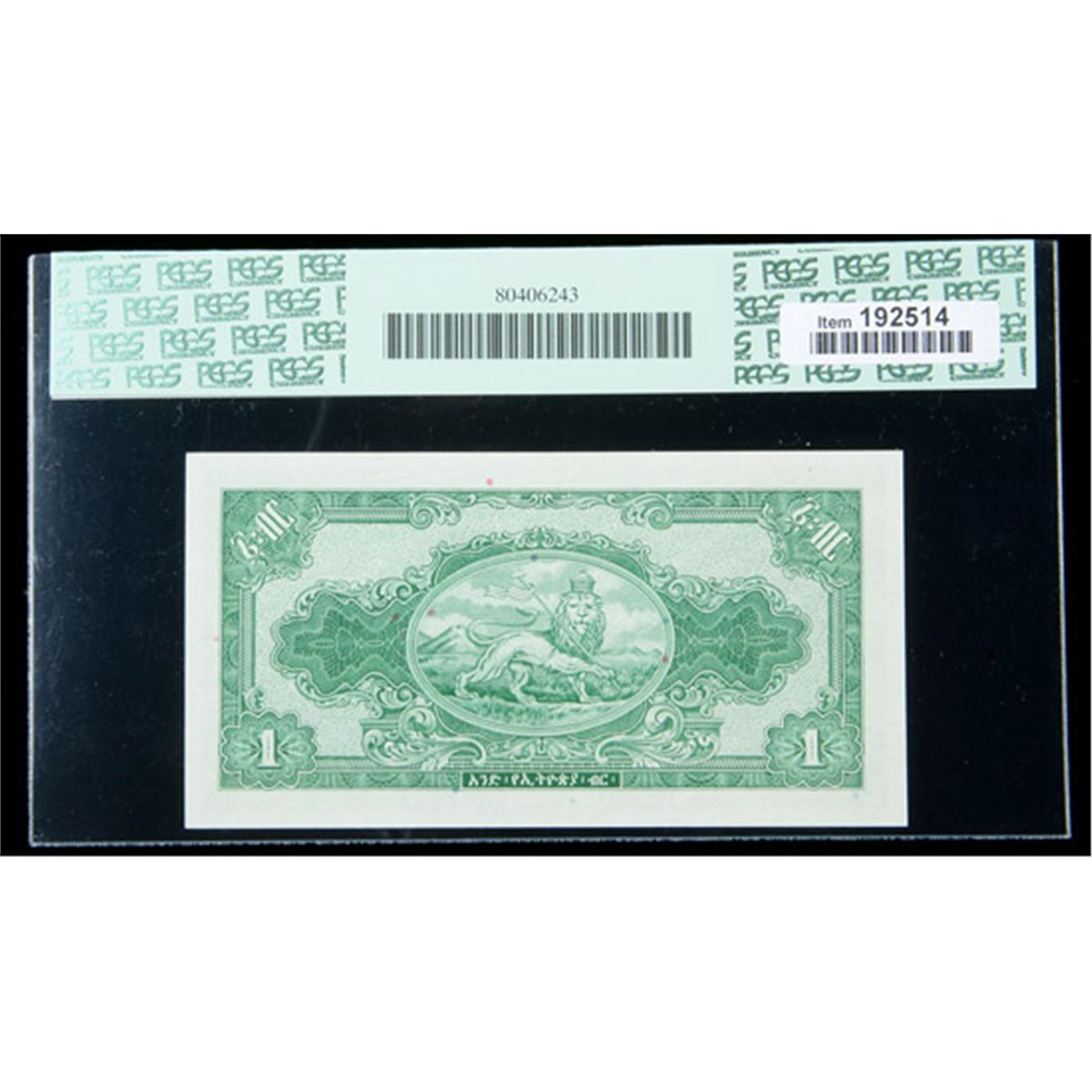 Ethiopa SCWPM# 12c, ND (1945) 1 Dollar. PCGS Superb Gem New 67PPQ. . Fr-P-12c. A superb example that is the single finest note from this issue graded by either of the two major grading services. A portrair of Emperor Haile Selassie is featured at left on the face.