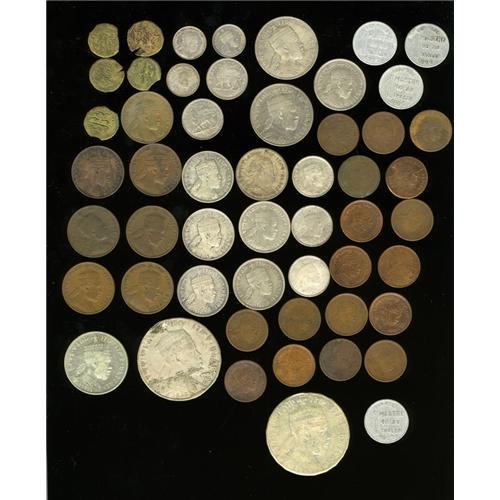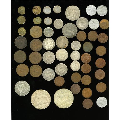 <B>Accumulation of Early Types, </B></I>this group of fifty-five coins and tokens represents years of collecting in the market in Addis Ababa and will provide the buyer with a nice group for resale or variety study. Province of Harar KM11 Brass Mahallak 1303AH, five examples all with clear dates, Menelik II KM9 1/100 Bir EE1889 (7), KM12 silver Gersh EE1895 (3) including one in toned UNC, KM2 1/8 Bir EE1887, very scarce type much underpriced in the SCWC (5), KM3 1/4 Bir EE1889 (3), and EE1895 (3), KM14 1/4 Bir EE1889, very scarce second reverse type (3) including one in toned XF, KM4 1/2 Bir EE1889 (3), KM5 Bir or Talari EE1889 (2), both genuine but with mount marks etc, KM10 1/32 Bir EE1889 with denomination effaced (11), reeded and plain edge, KM11 1/32 Bir EE1889 with denomination (6) reeded and plain edge, and Dire Daoua aluminum Piastre tokens KM-Tn1 1922 (4), very scarce issue. Grades range from Fine to XF, some with small defects or have been cleaned. An interesting lot from this fascinating country. Total current retail value estimated at $1100. <B>Sold as is, no return lot.</B></I><BR><BR><b>Shipping:</b> Coins & Currency (<a target="_blank" href="http://www.heritageauctions.com/common/shipping.php">view shipping information</a>)