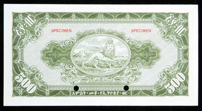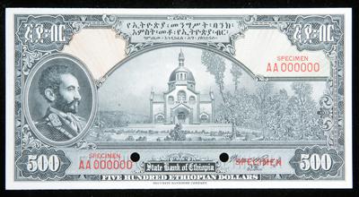 Ethiopia. Specimen Set: 1, 5, 10, 50, 100 and 500 Dollars, ND (1945). P-12-17 type. Unlisted as Specimen's. Emperor Halle Selassie at left with different scenes in the center. State Bank of Ethiopia. Issued by Security Banknote Company. All with Serial number AA000000. Probably a very rare set. Set of 6 Notes. Crisp Uncirculated.