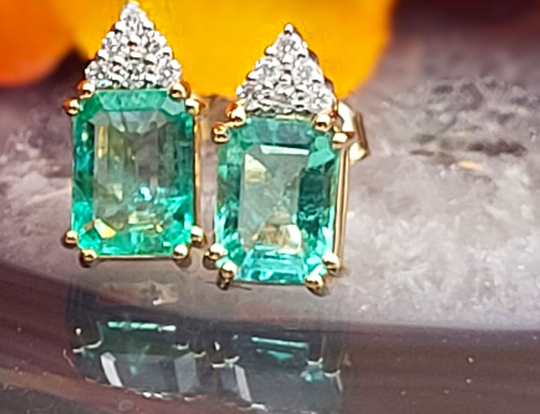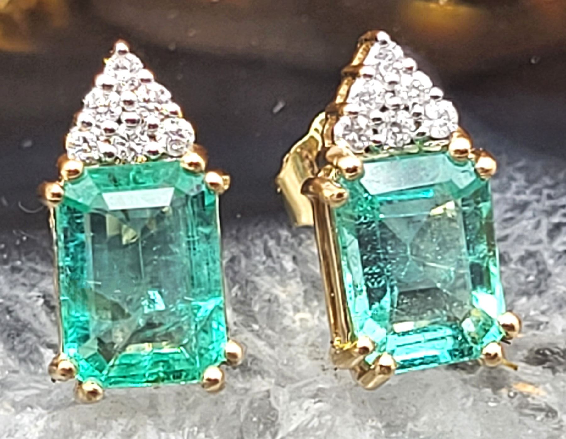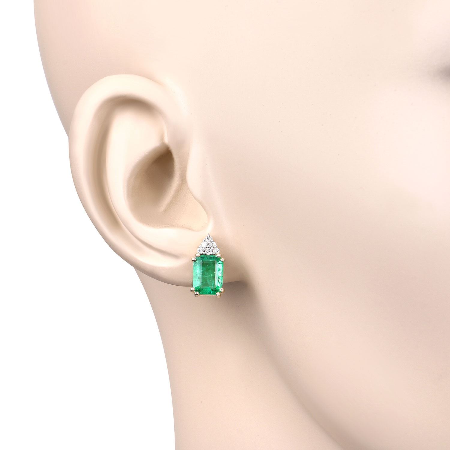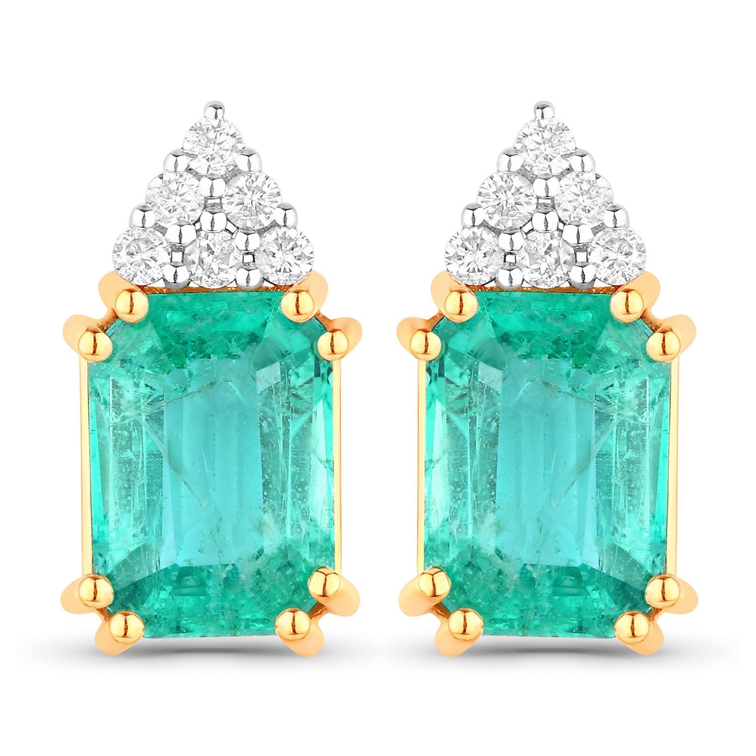 The cool minty green color of the 2.75 carats total weight of octagonal-cut, genuine Ethiopian* emeralds is like a blast of fresh air on a hot, summer day! The bright green emeralds are topped with an icy frosting of .12 carats total weight, round, brilliant-cut, H-I color, I1 clarity, genuine, Earth-mined, diamonds. Each emerald is 8mm x 6mm and the earrings attach to the earlobe with posts and friction backs. Admin: Q5743/9-