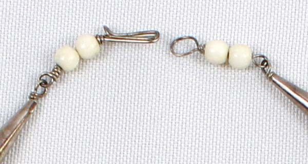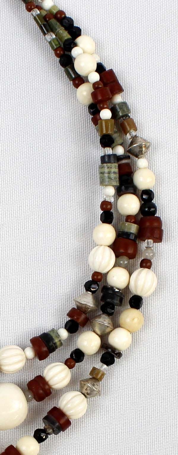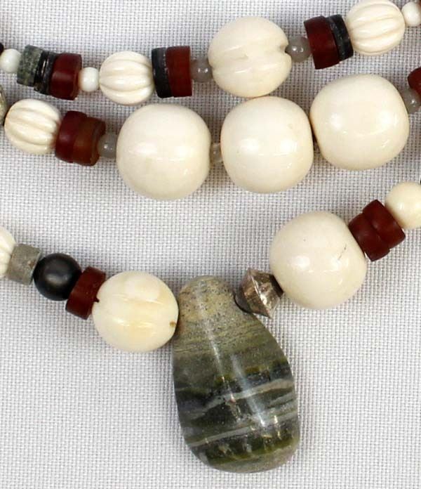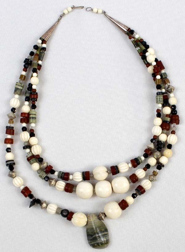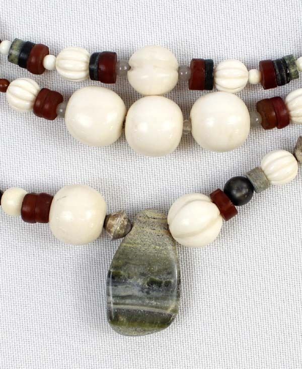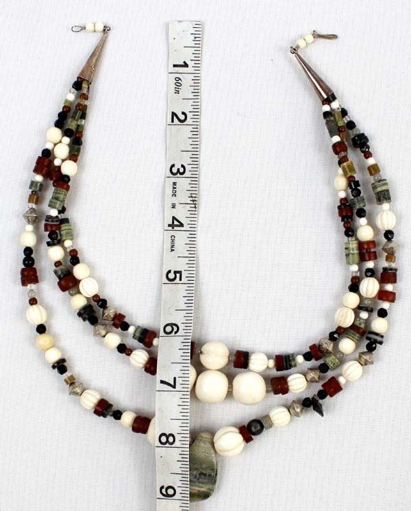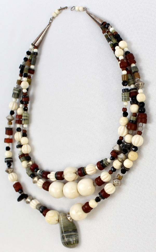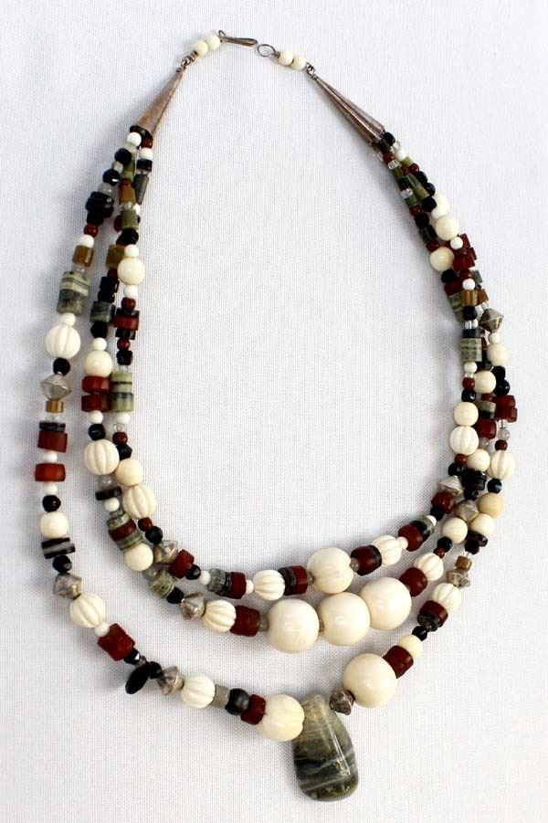 Ethnic 3 Strand Pendant Necklace, measures 16''L end to end, features serpentine pendant measuring 1 3/8''L x .75''W, carved bone beads, hollow metal beads, glass and stone beads, largest bead measures 5/8''D