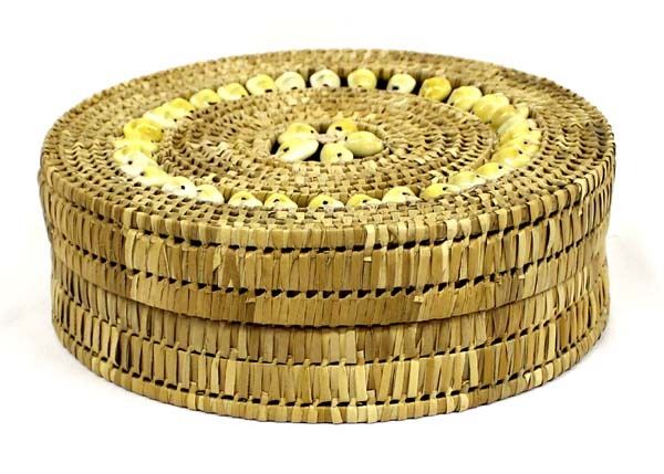 Ethnic Cowry Shell Lidded Basket, measures 3'' x 9.5'', well made