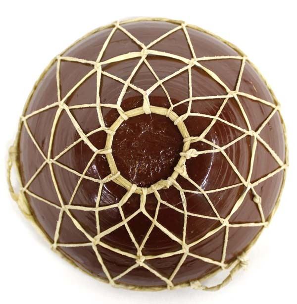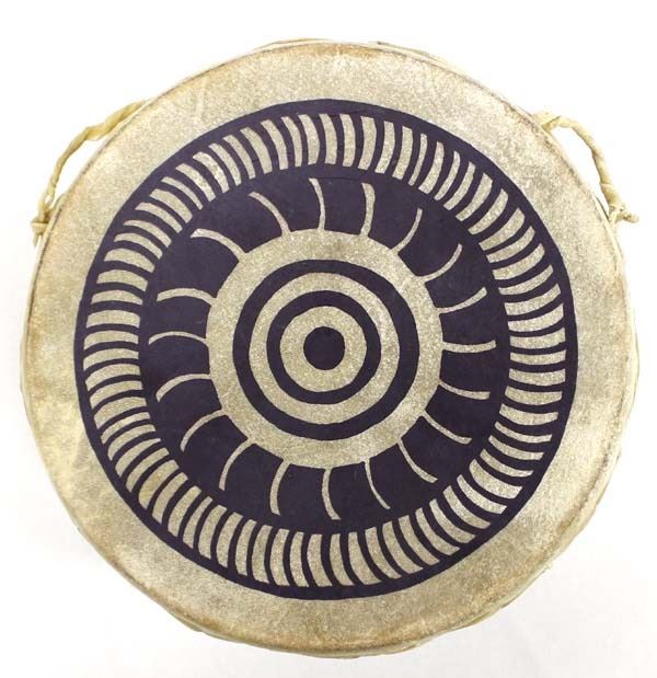 Ethnic Hide and Pottery Drum, measures 6'' x 2.5''H, small hide handle, hand painted sun design on head of drum
