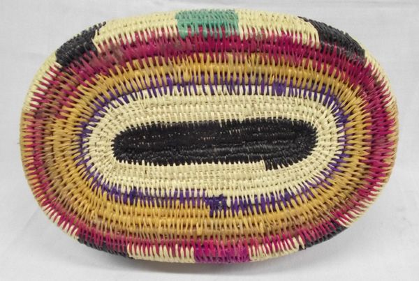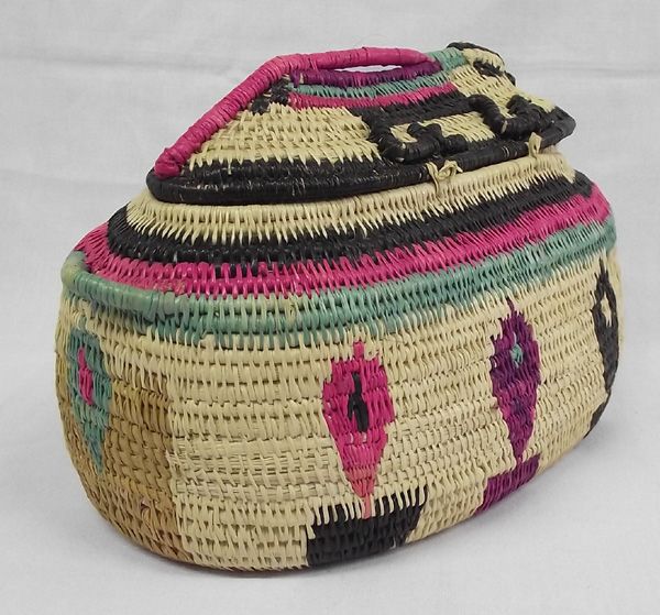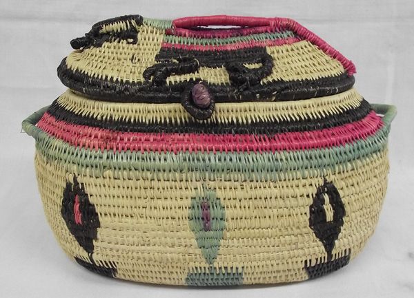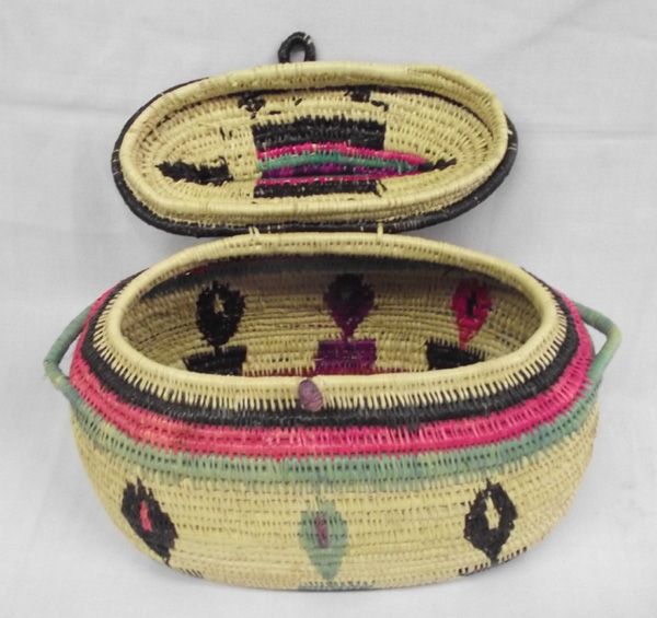 Lidded Multi Color Tribal Basket. Skillfully woven light tan basket with various designs in brown, green, pink, dark tan and cranberry. The lid has a loop and button closure and has two fiber-strand hinges. Small handles are woven into the sides. Measures 6.5''Hx11''Lx6.25''W.