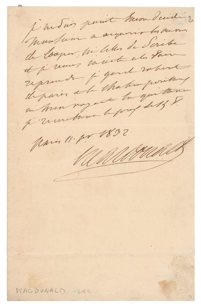 ALS in French, signed "Macdonald," one page, 4.75 x 7.5, January 11, 1832. Untranslated handwritten letter sent from Paris. In fine condition.