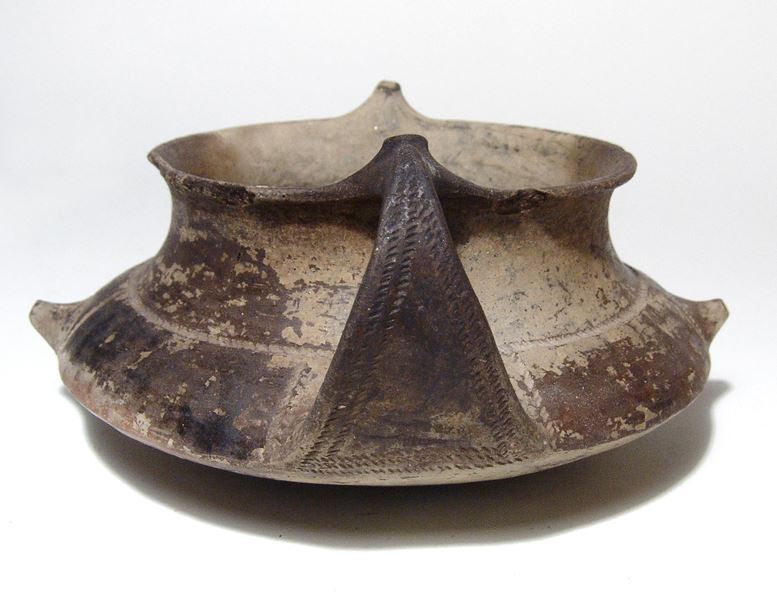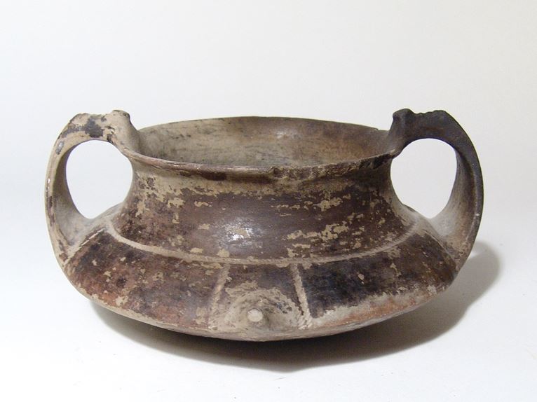 An Etruscan Bucchero two handled vessel, Italic, c. 7th Century BC, the body of low profile with sharply carinated sides and lightly concave base. The neck in concave with lightly flared mouth and two flat handles, each with a wide base narrowing at to surmounted by ridges and a single circular knob. The body is nicely decorated with an incised rope pattern around the base of the neck and handles as well as around the horned protrusion extending from each side of the body. A most interesting and attractive shaped with nicely burnished surfaces and light deposits. H: 2 7/8 in (7.4cm). Few minor rim chips. Ex South German private collection of an artist and art collector, purchased between 1960 to 1980.