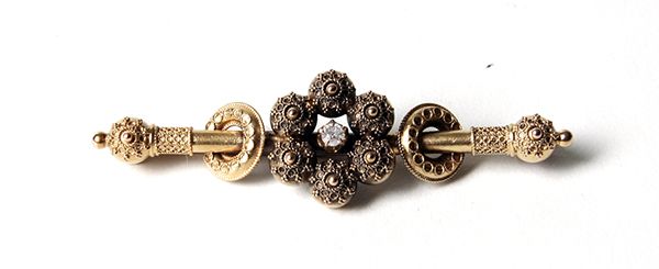 Etruscan Diamond, 14k Yellow Gold Brooch. Featuring one Old Mine cut diamond, gross weight 5.10 grams, measuring approximately 2 inches in length.