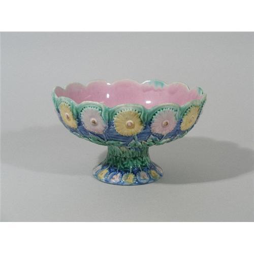 Etruscan Daisy Salad Compote, Early 1880's - Cobalt background w/rose interior. Griffen, Hill, and Smith (GSH) monogram mark inside the pedestal, pictured on p.31 "The Collector's Encyclopedia of Majolica", 5.25"h x 9.25"d