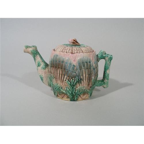ETRUSCAN MAJOLICA Shell & Seaweed Coffee Pot, Late 1800's - produced by Griffen, Hill, and Smith of Pennsylvania, original lid w/conch shell finial, circular Etruscan stamp to the base and number E24; several tiny chips to bottom rim of the lid, 6.5"h x 9.5"l