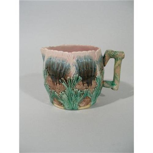 ETRUSCAN MAJOLICA Shell & Seaweed Pitcher, Late 1800's - produced by Griffen, Hill, and Smith of Pennsylvania, with excellent mold definition, some minor staining to the rim, the bottom w/circular Etruscan stamp and blurred number E25?; 5.75"h x 8.5"w