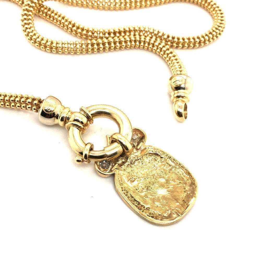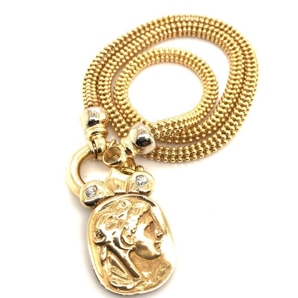 DESCRIPTION DETAIL: A beautiful Italian Gold necklace featuring a Repousse Soldier with two natural round brilliant cut Diamonds hung on a popcorn/caviar style chain.