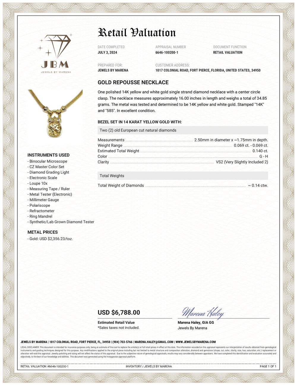 APPRAISAL REPORT: This necklace has appraised for $6,788.00 estimated retail replacement value, according to JBM (Jewels By Marena).