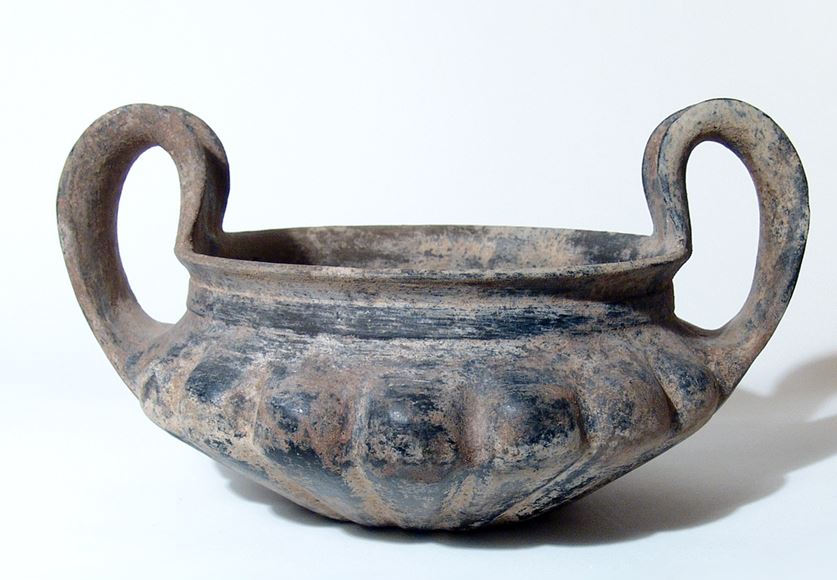 A large Etruscan/Villanovan two-handled Impasto vessel, Italic, c. 8th Century BC, with body with vertical lobes tapering to a narrow flat base, the neck with wide rounded ridge and the mouth flared widely. On opposing sides are two large looping handles, each with raised flanges on the edges and join from the shoulder to the rim. A very large and quite elegant piece! H: 6 1/8 in (15.5cm). A nice example with some old repair to bottom and earthen encrustation on the burnished surfaces. Ex South German private collection of an artist and art collector, purchased between 1960 to 1980.