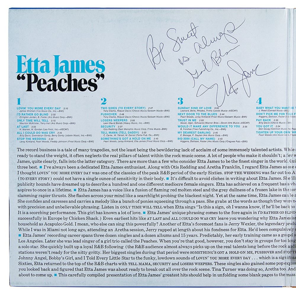 Peaches album signed inside the gatefold in black ballpoint, "Be sweet as always, God bless, Etta James." In fine condition, with a Beckett label affixed to the reverse (certificate of authenticity not present). The records are included.