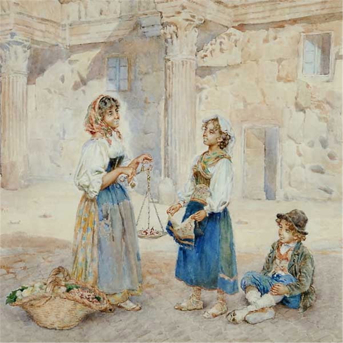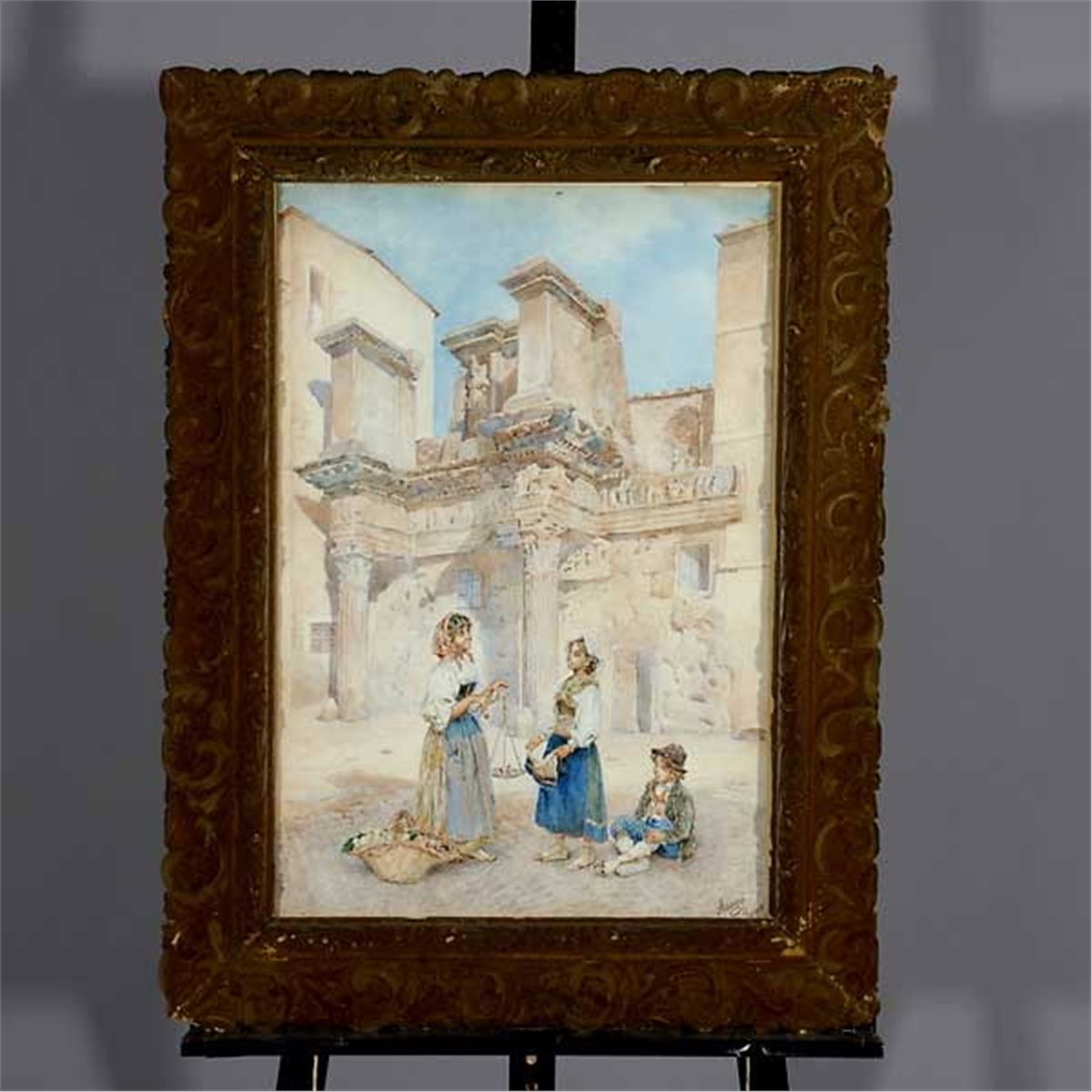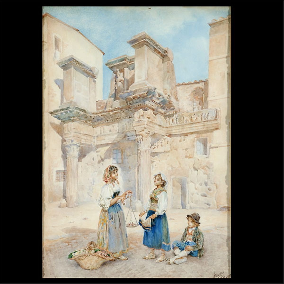 ETTORE ASCENZI (Italian 19th/ 20th century) Vendita dei Fiori, circa 1900 Watercolor on paper Sight: 21.25 x 14.50 inches/ 54 x 36.8 centimeters Signed lower right "Ascenzi Roma" Frame: 27.50 x 20.50 inches/ 70 x 52 centimeters In very good condition, Framed and glazed. Not examined out of the frame.